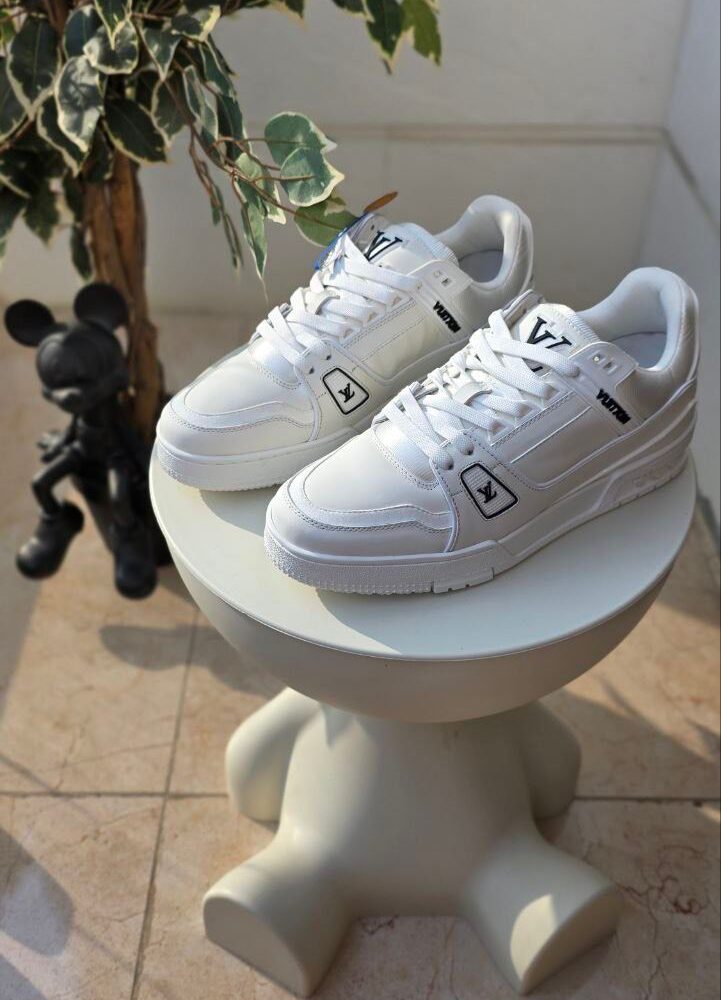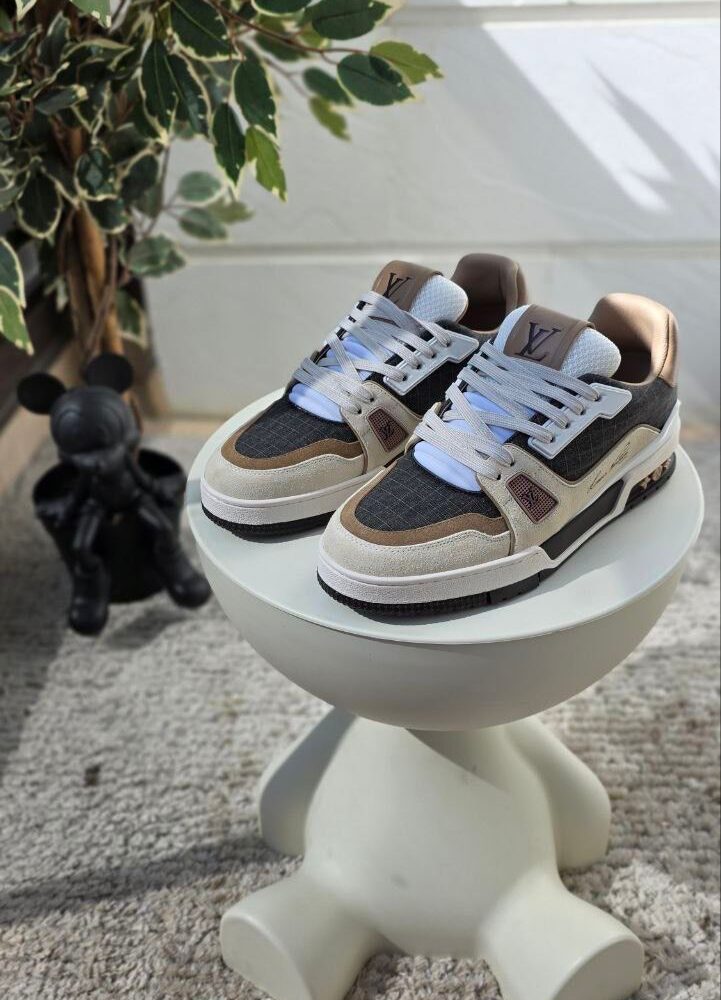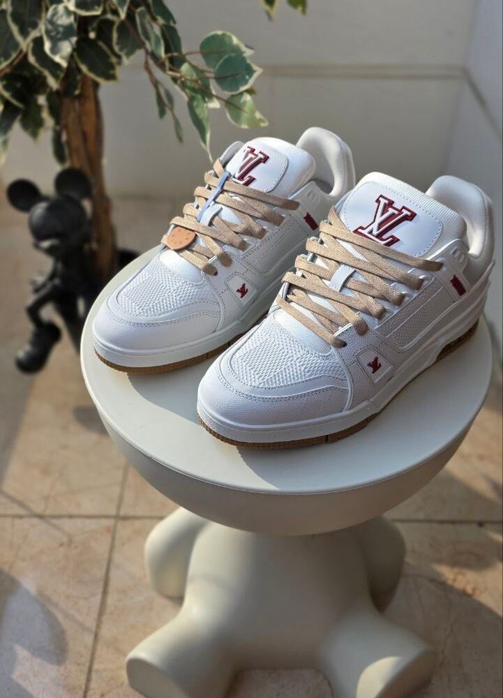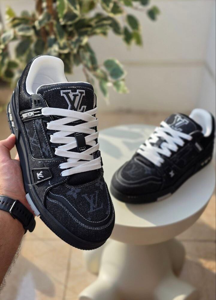 Black Louis Vuitton monogram crossbody with a bold red graffiti-style LV logo and matching cardholder.