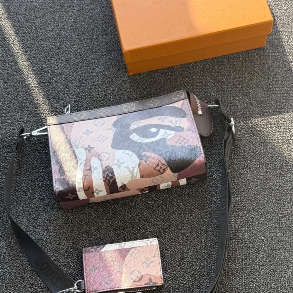 A pink-brown Louis Vuitton sling bag with an artistic camo design and matching cardholder.