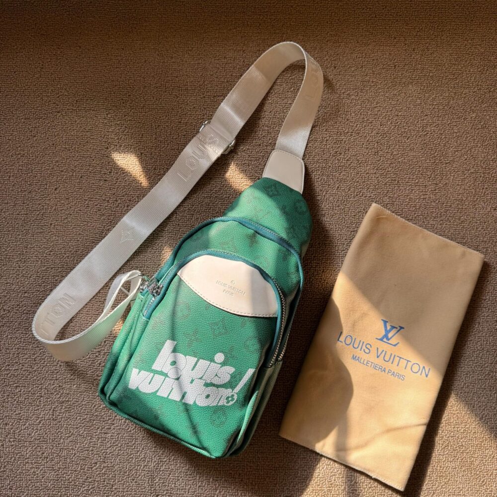 Green Louis Vuitton monogram sling bag with bold white logo, cream strap, and multiple zip pockets.