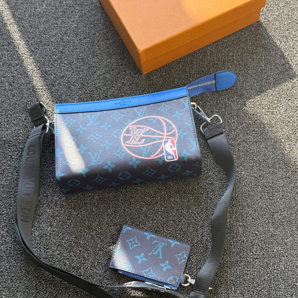 Dark blue LV monogram sling bag with NBA basketball graphic and matching cardholder.
