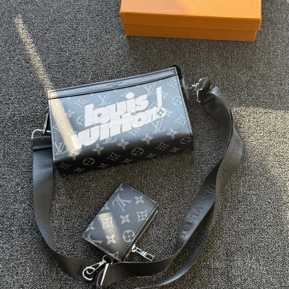 Black Louis Vuitton Monogram Eclipse crossbody bag with bold white logo and matching detachable pouch.