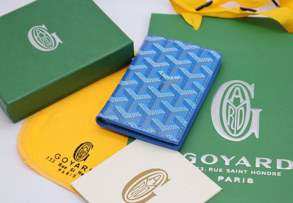 Iconic blue Goyard monogram wallet with a slim profile and refined luxury finish.