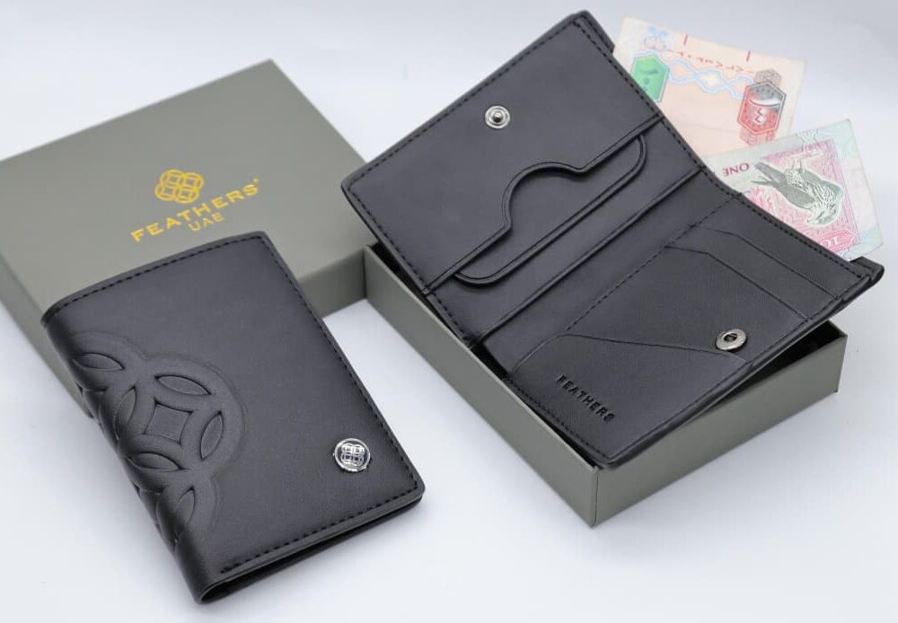 Premium black pebbled leather wallet with a slim bi-fold design by Feathers UAE.