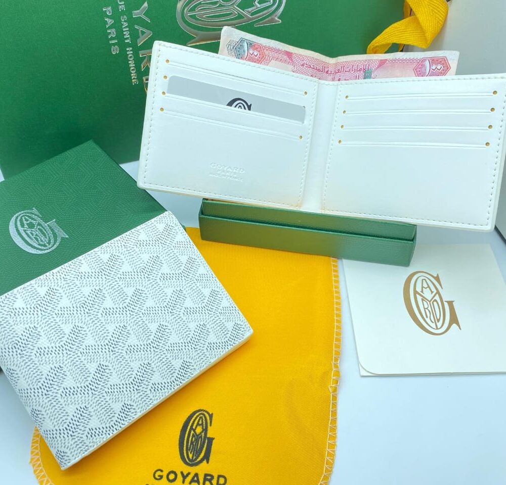Luxury white Goyard monogram bi-fold wallet with a slim profile and refined leather interior.