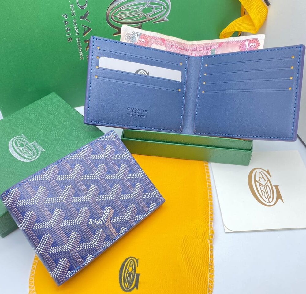 Iconic blue Goyard monogram canvas bi-fold wallet with a premium leather interior and slim profile.