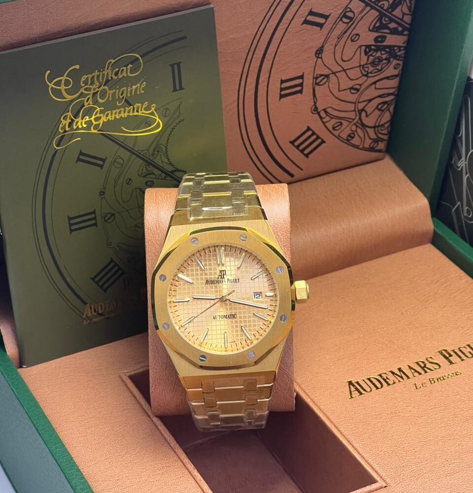 Classic Royal Oak in 41 mm 18k yellow gold with automatic movement, integrated bracelet, and signature octagonal bezel—an icon of Swiss luxury watchmaking.