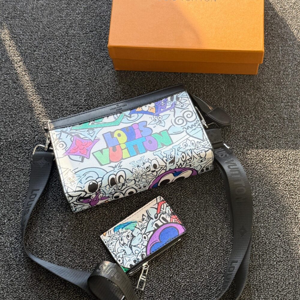 A colorful Louis Vuitton crossbody bag with a graffiti-style cartoon print and matching card holder.