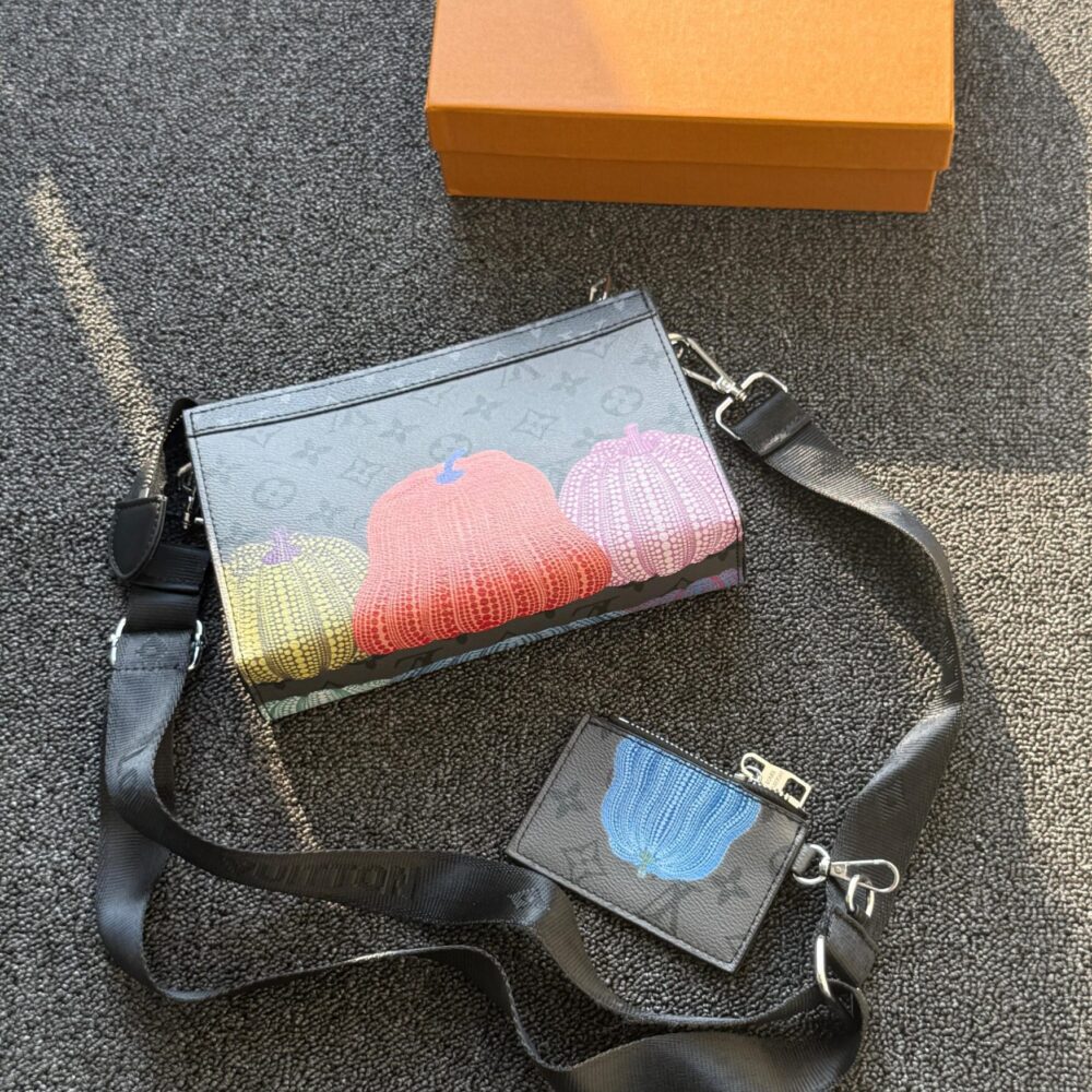 A Louis Vuitton crossbody bag set featuring colorful pumpkin artwork and matching pouch, inspired by Yayoi Kusama’s design style.