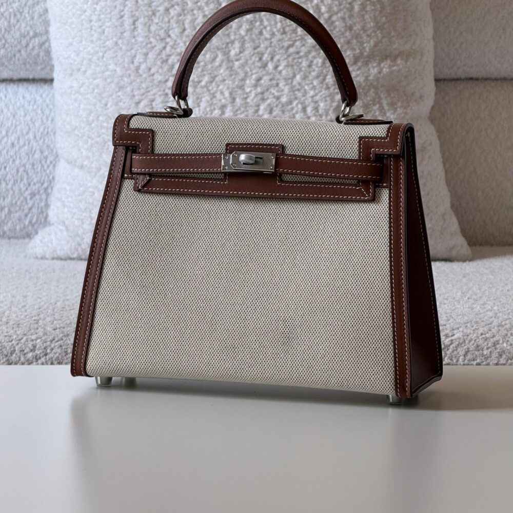 Taupe canvas top-handle bag with black leather trim and silver clasp.