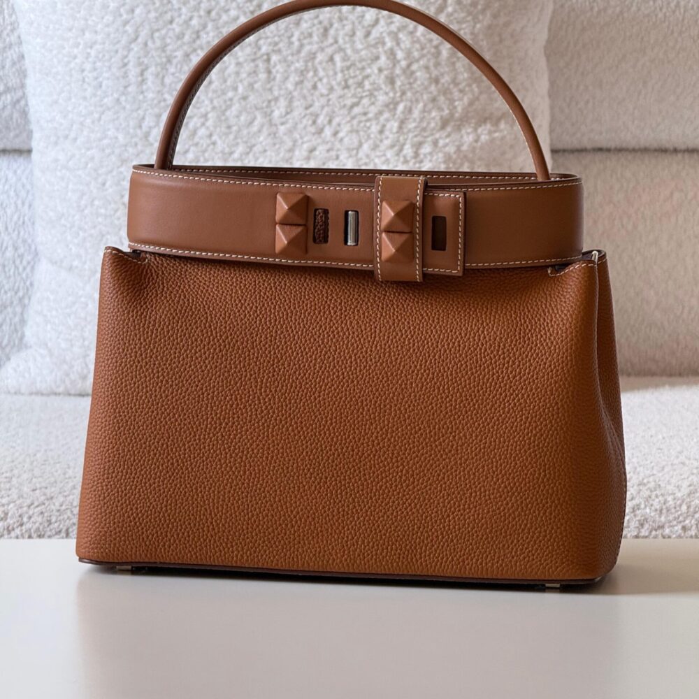 Elegant tan leather top-handle bag with structured design and signature belt closure.