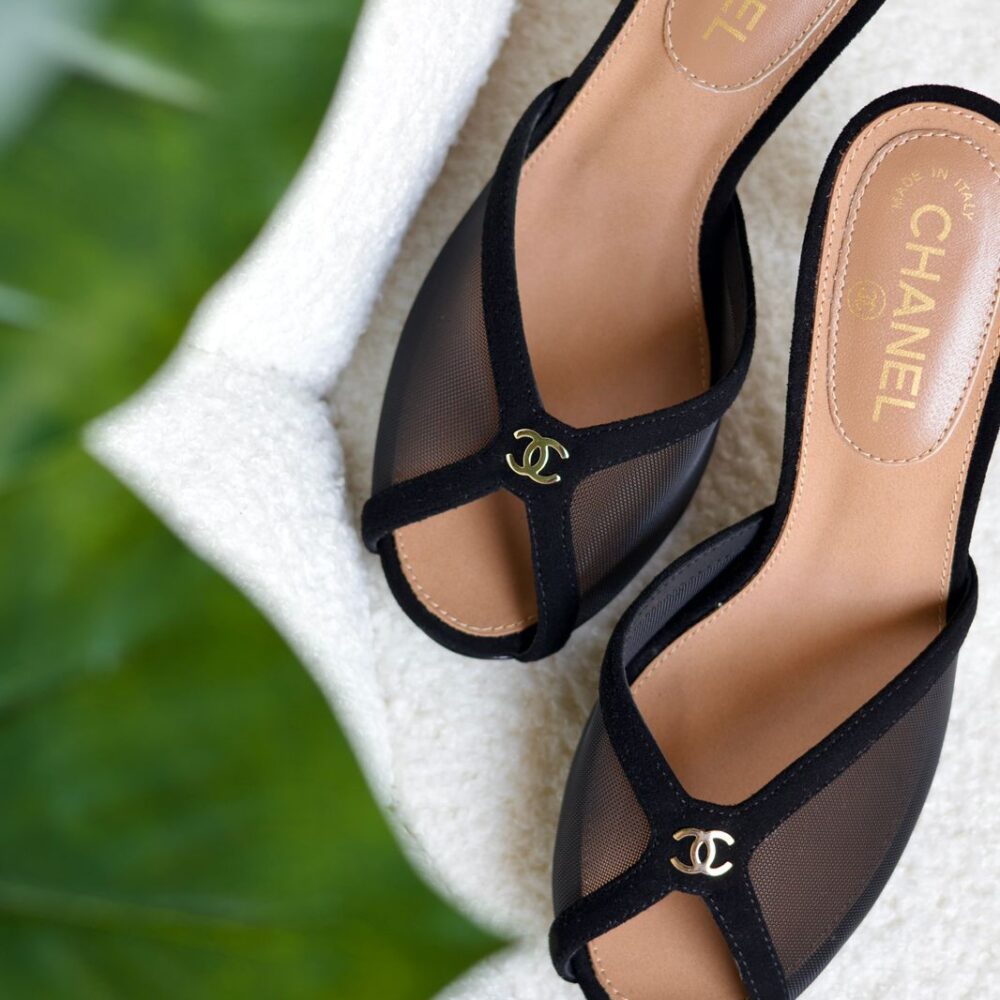 Black mesh Chanel mules with suede trim and gold CC logo—lightweight, breathable and unmistakably chic.