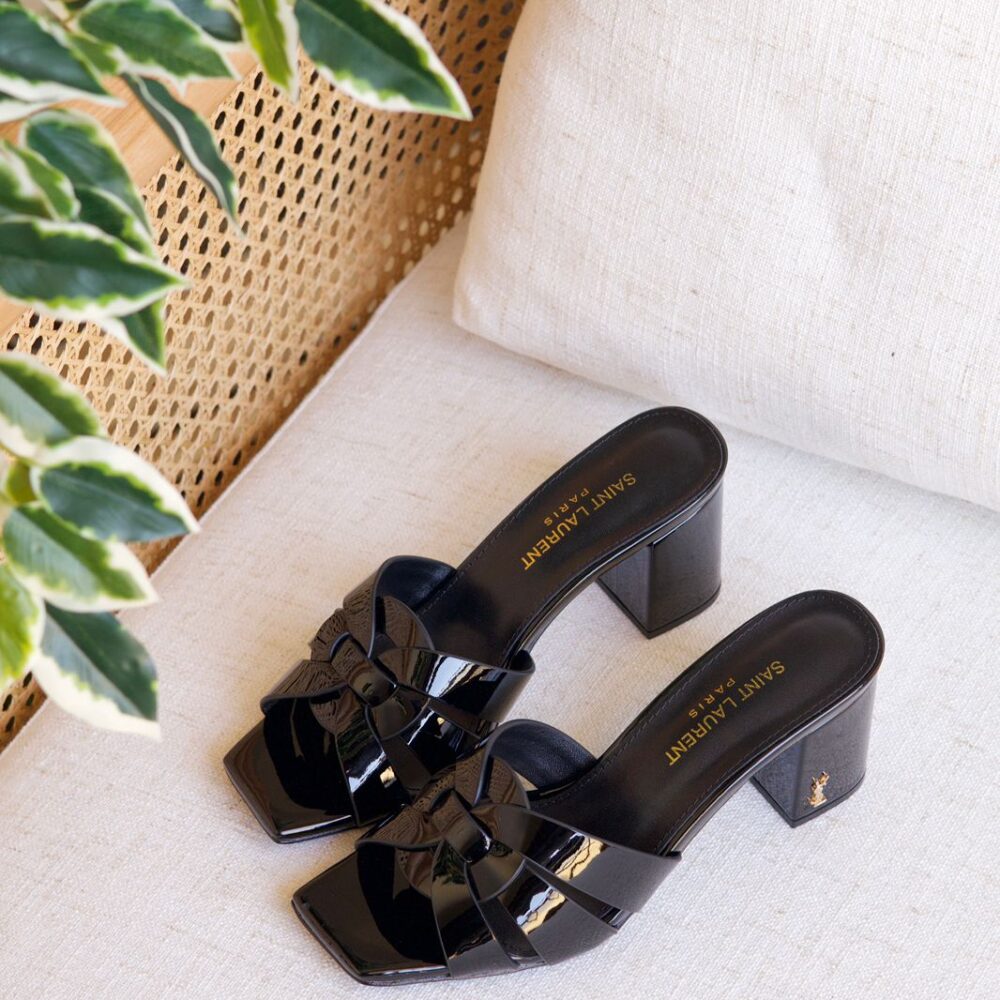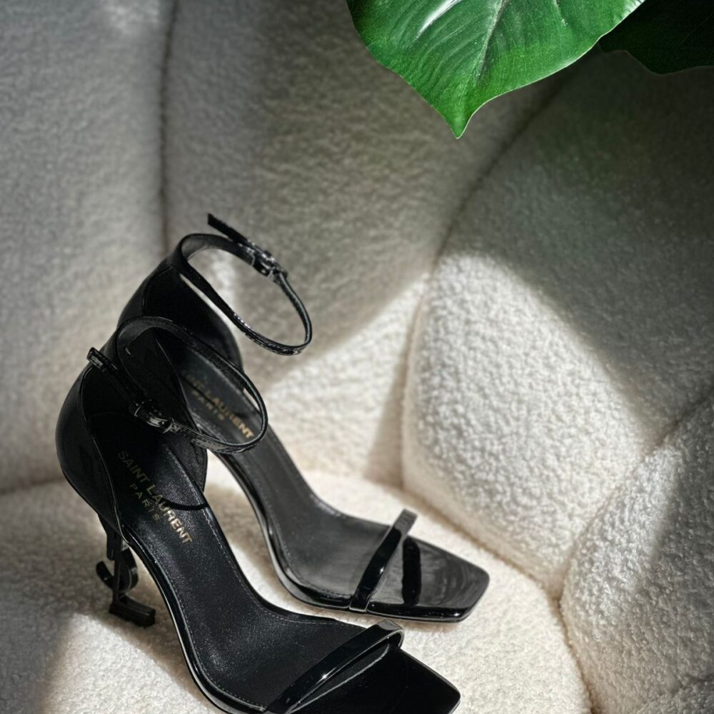 A daring and sophisticated statement piece, the Opyum Sandal balances a minimalist patent leather strap design on a sculptural YSL monogram heel, blending Parisian elegance with modern architectural edge.