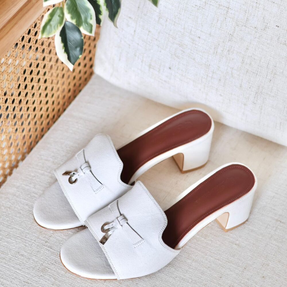 White leather Loro Piana mules featuring the signature horsebit and a comfortable block heel for timeless everyday elegance.