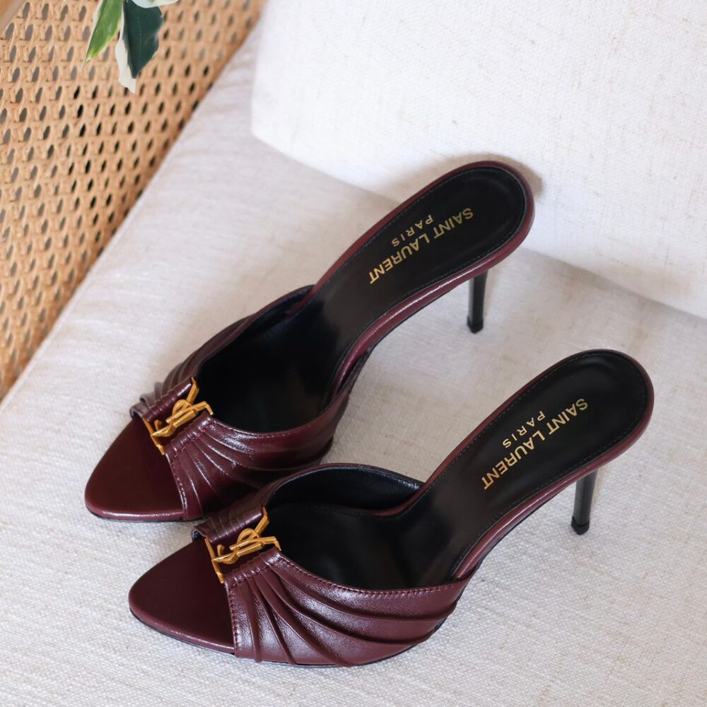 Pointed peep-toe stiletto mules in smooth calfskin leather, featuring a draped, ruched upper accented with the iconic gold-tone YSL Cassandre monogram.