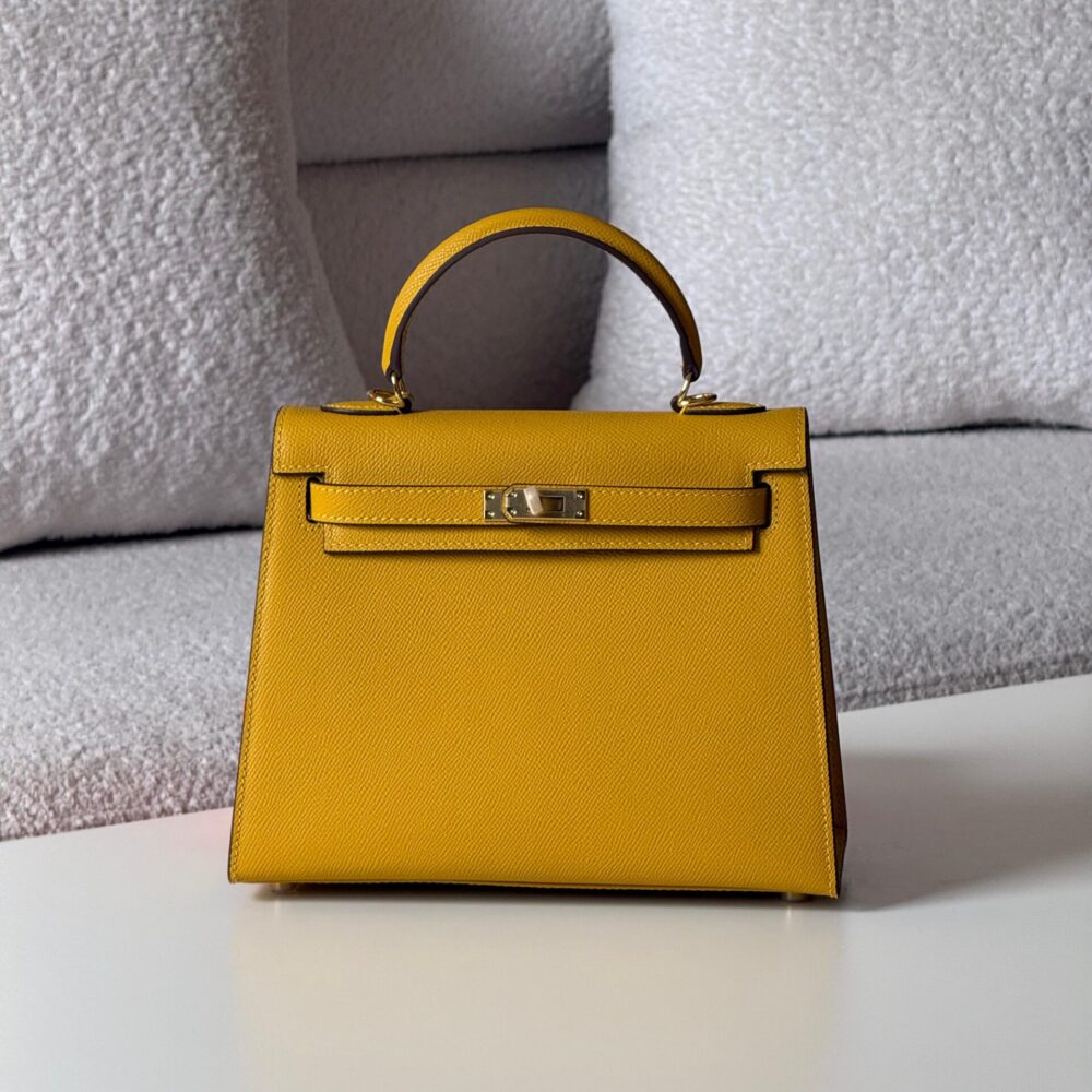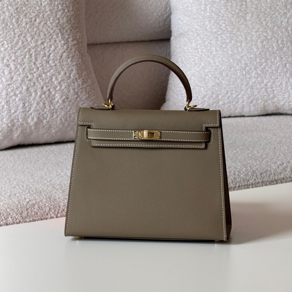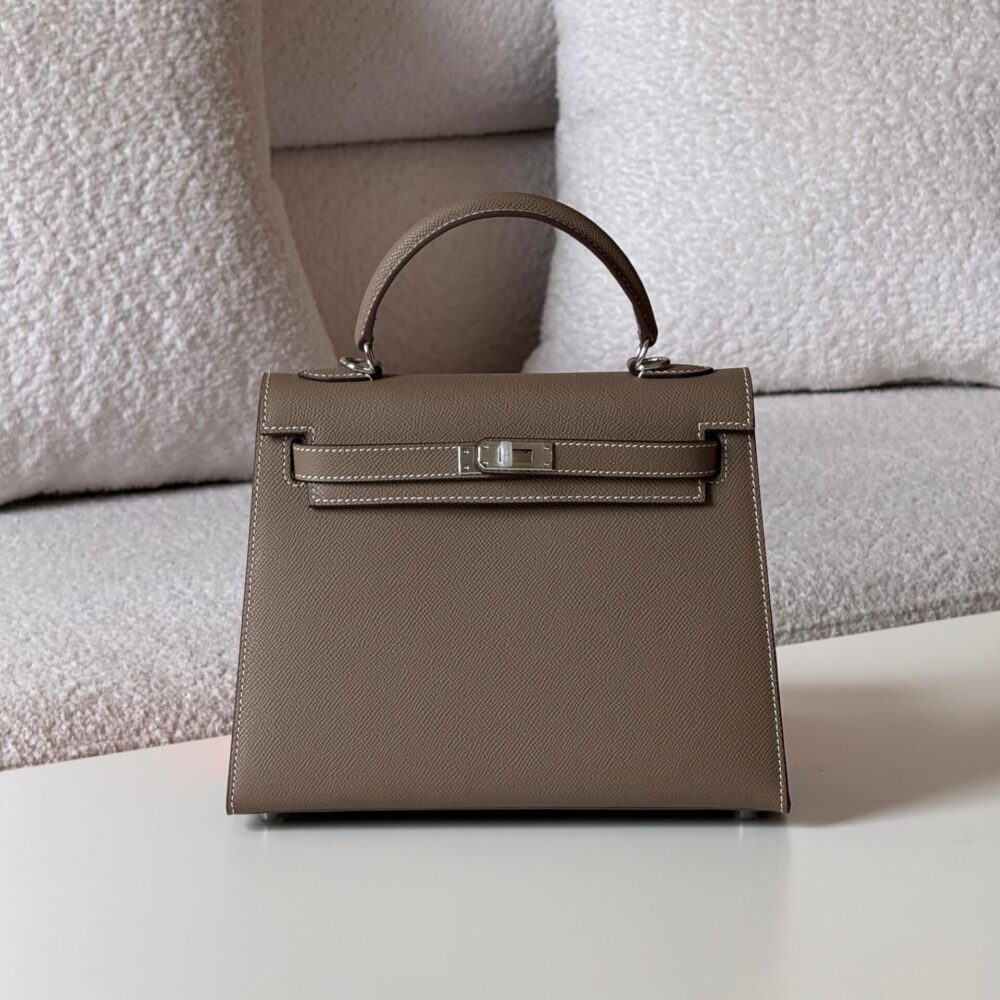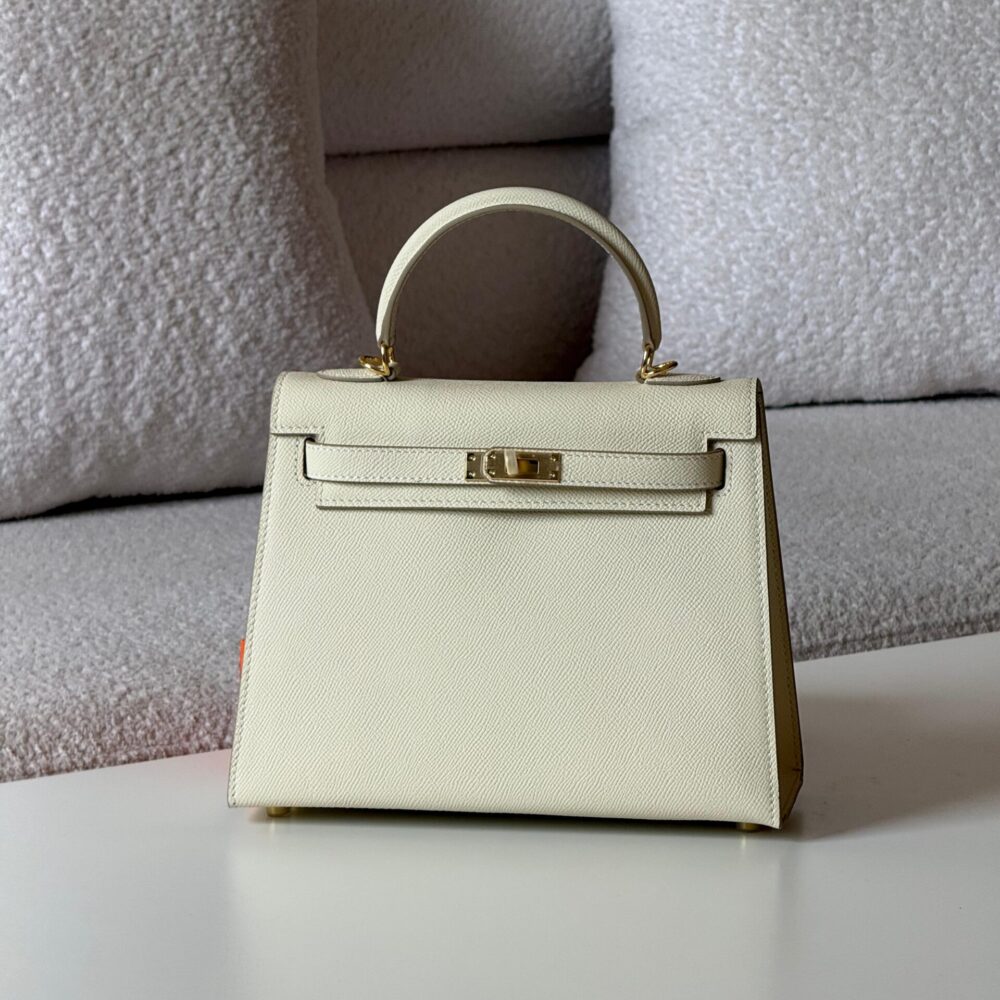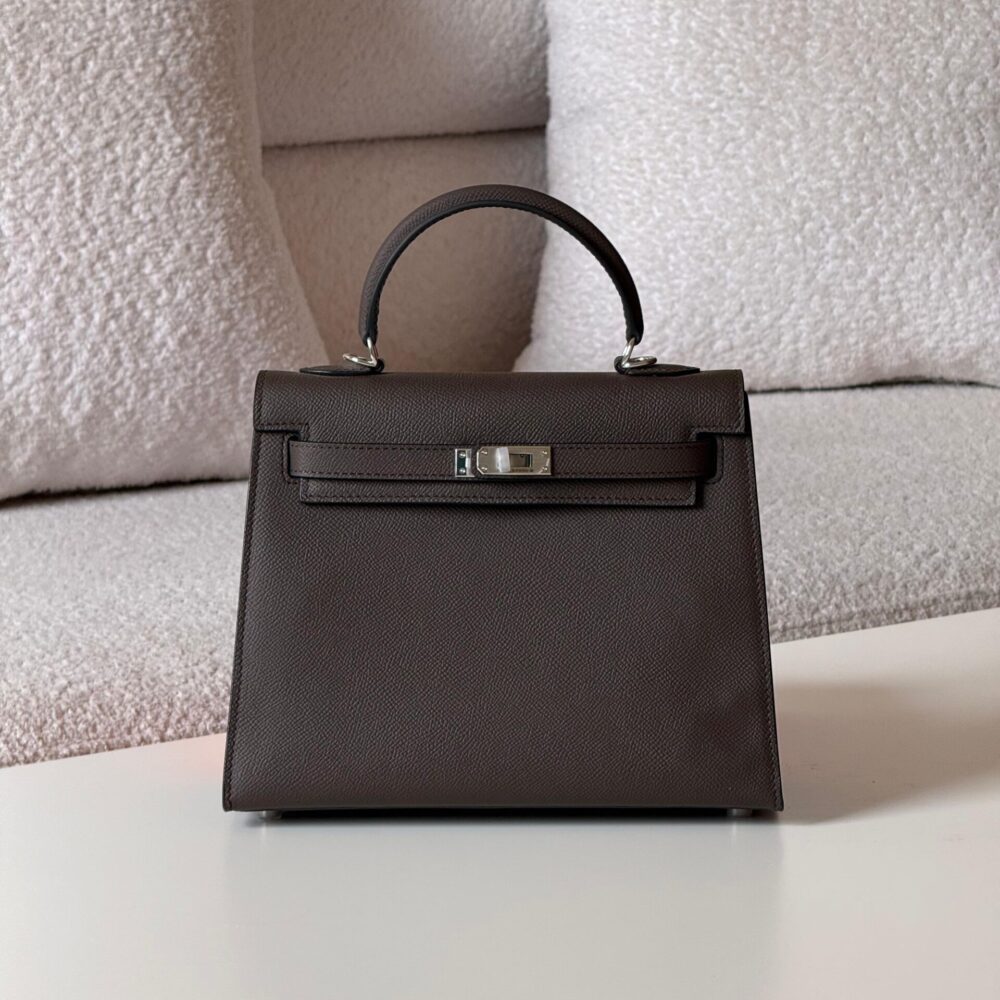 Iconic Hermès Kelly Colormatic handbag in brown leather with cream accents and signature gold hardware.