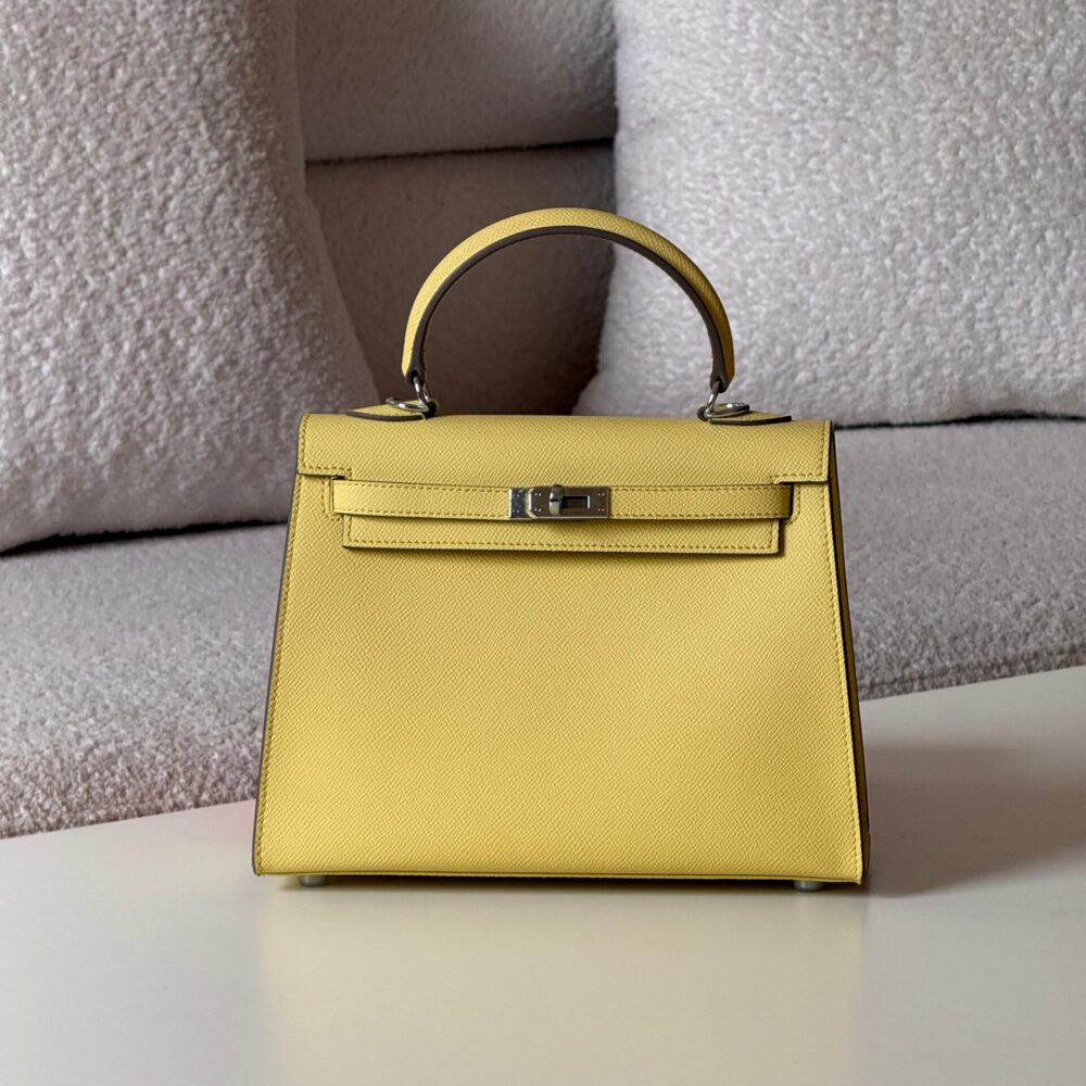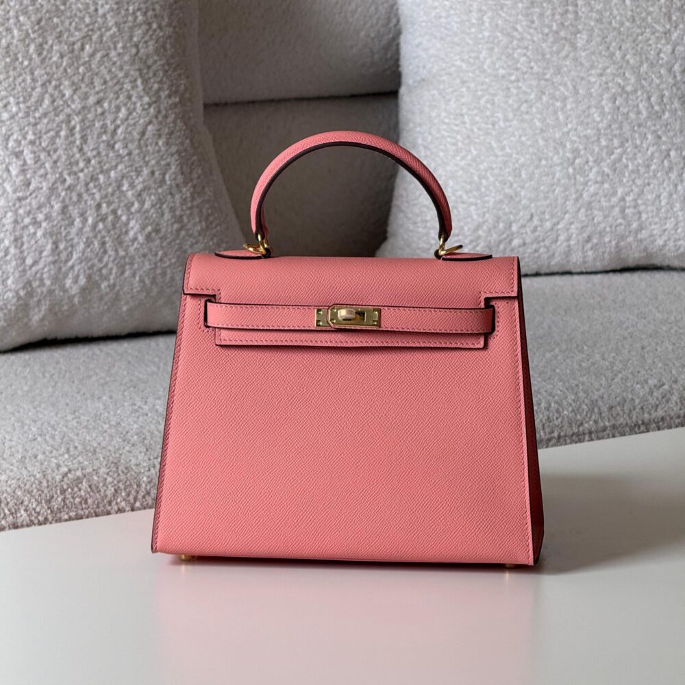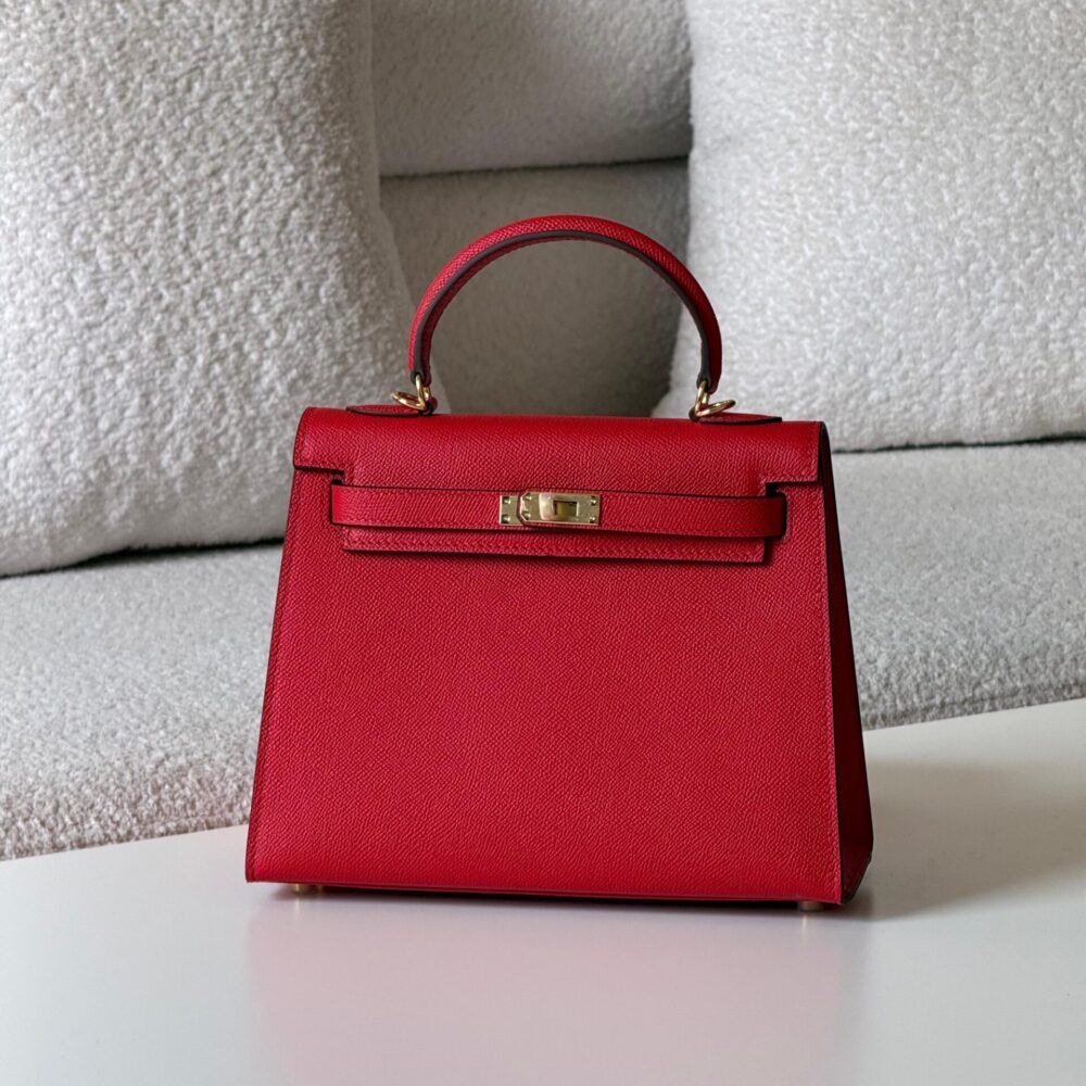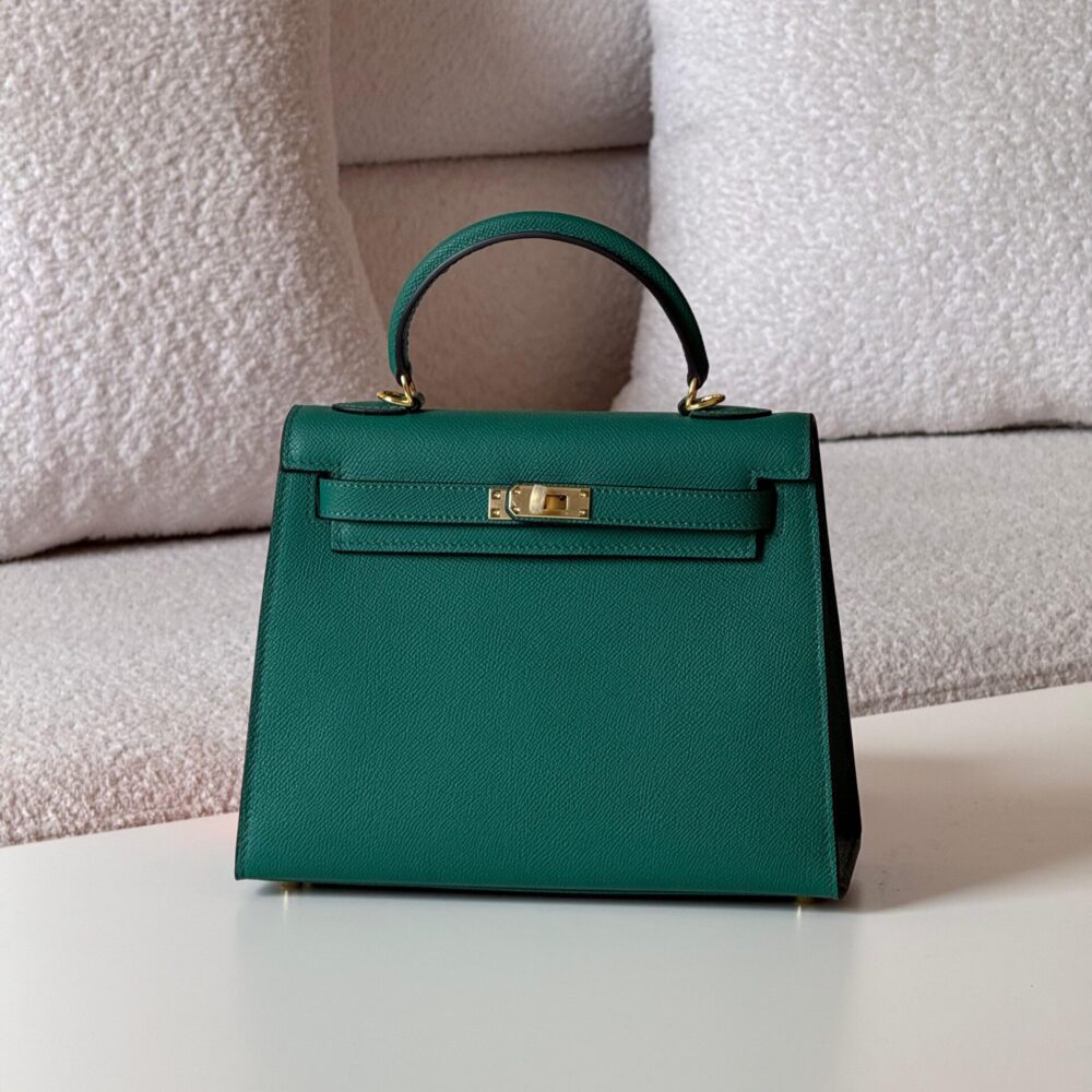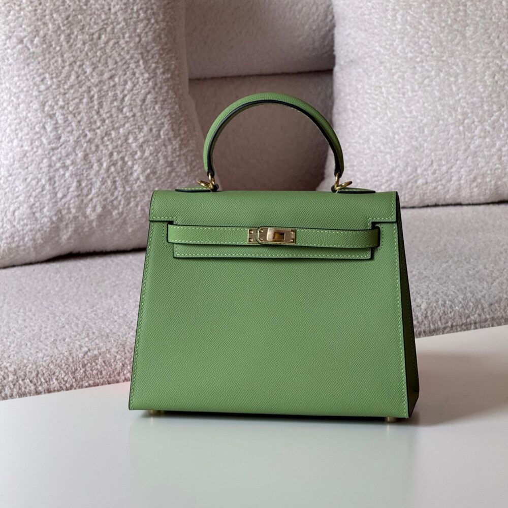 Iconic Hermès Kelly Colormatic handbag in brown leather with cream accents and signature gold hardware.
