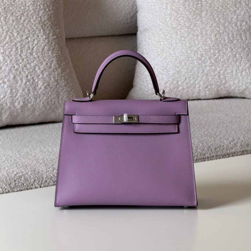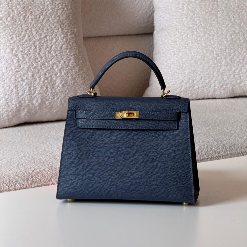 Elegant Hermès Kelly Colormatic handbag in navy leather with signature hardware and modern contrast details.