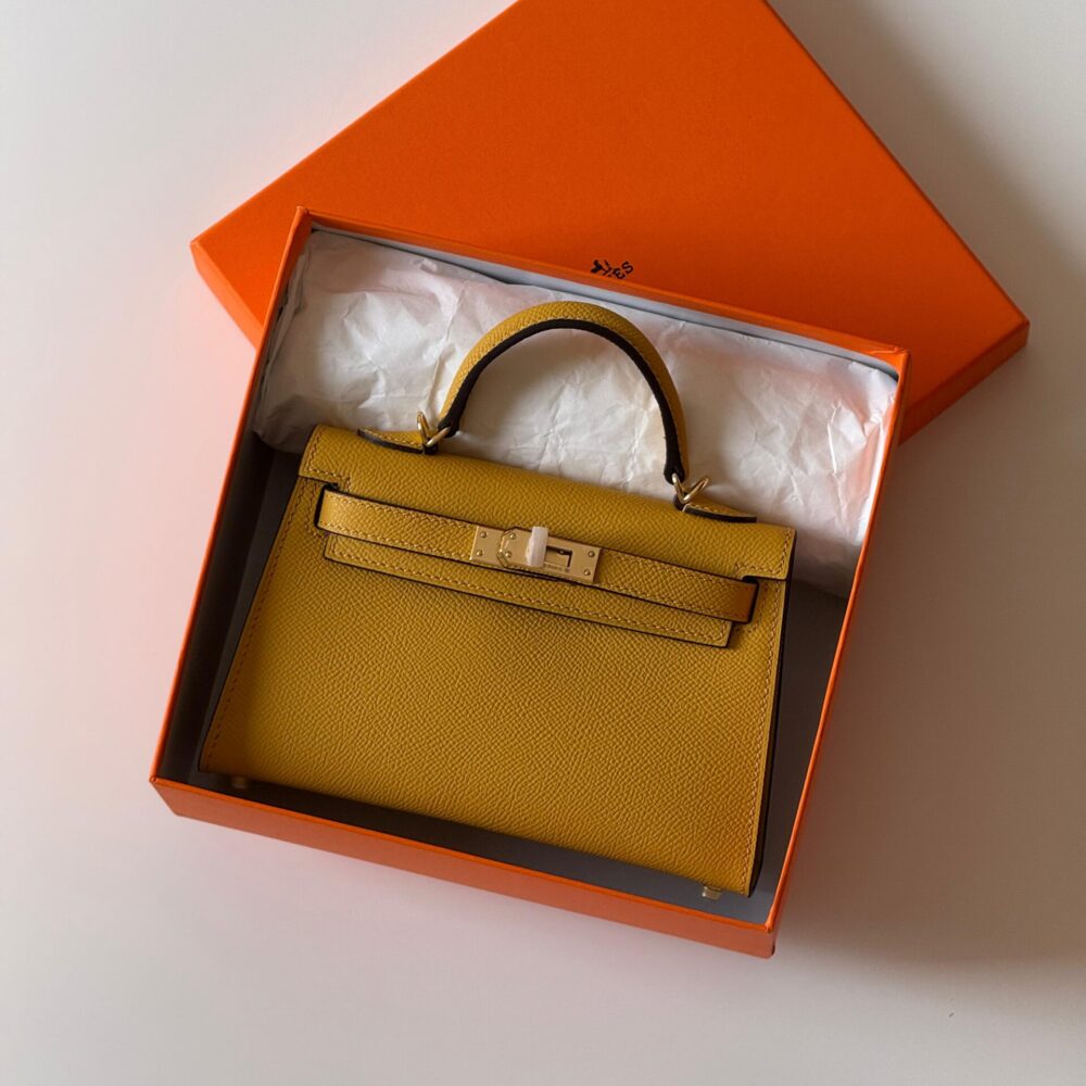 Hermès Kelly Mini II in yellow Epsom leather with gold hardware—bold, iconic, and impeccably crafted.