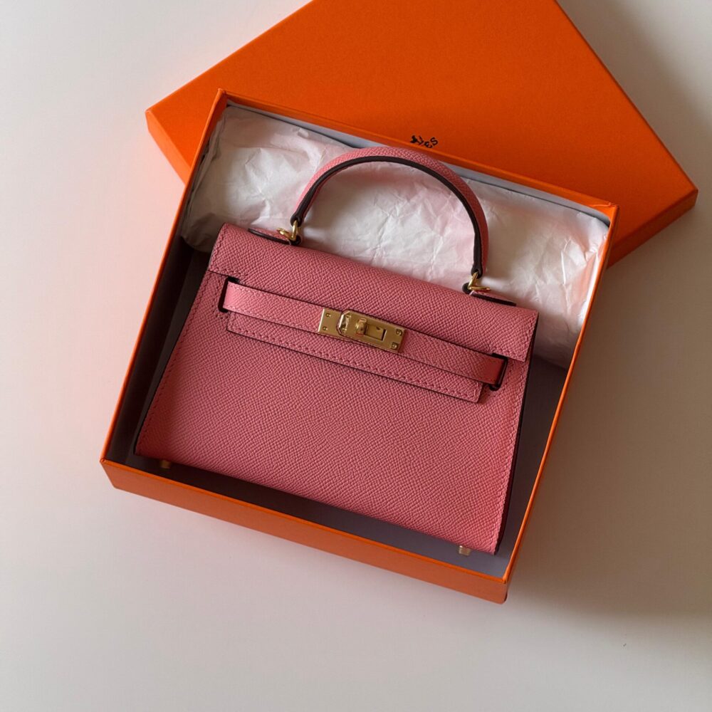 A compact Hermès Kelly Mini in pink Epsom leather with gold hardware—iconic, structured, and effortlessly elegant.