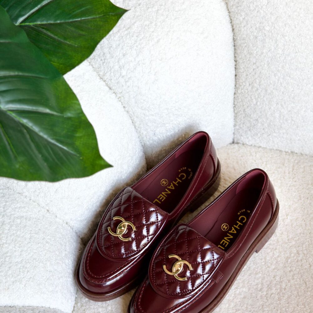 Burgundy patent quilted leather Chanel loafers with a gold-tone CC turnlock and low heel for elegant, modern sophistication.