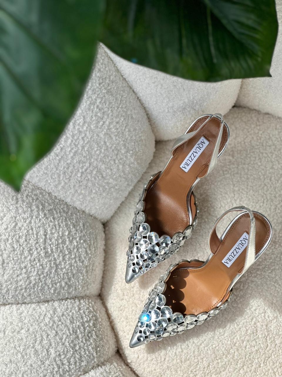 The Aquazzura Tequila Crystal Slingback Heels are a striking expression of glamour and craftsmanship. Designed with a sharp pointed toe, this elegant silhouette is fully adorned with Aquazzura’s iconic faceted crystal embellishments that catch and reflect the light beautifully. The metallic silver leather base enhances the luminous effect, while the slim slingback strap ensures a secure and refined fit. Finished with a sleek stiletto heel and smooth leather lining, this style is ideal for evening occasions, celebrations, and statement dressing.
