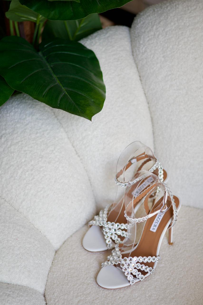 The Aquazzura Tequila sandal heels are a signature expression of glamour and elegance. Designed with delicate, crystal-encrusted straps, this refined style sparkles beautifully with every step. The open-toe silhouette is complemented by transparent details and a slim stiletto heel, creating a light, feminine look that elongates the leg. Perfect for weddings, evening events, and special occasions, these heels combine luxurious craftsmanship with timeless sophistication.