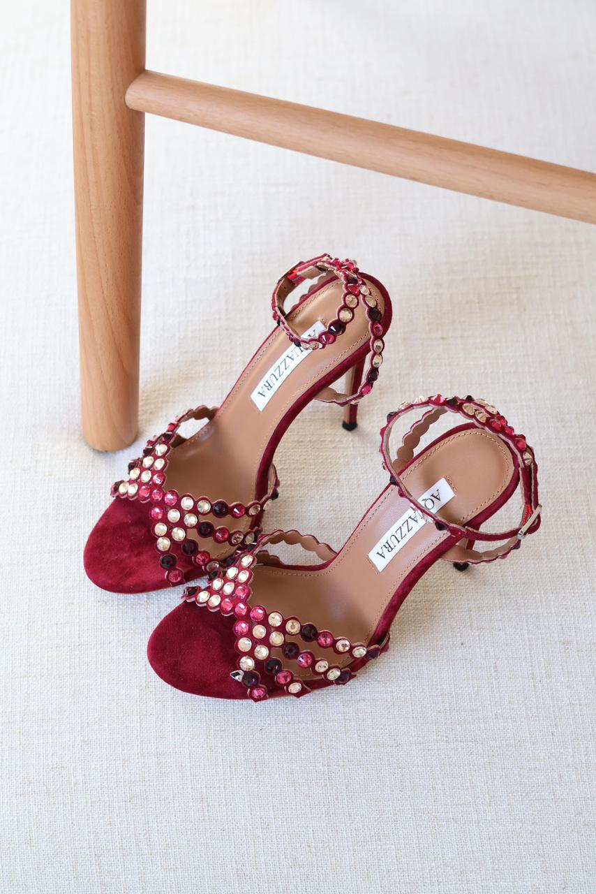 The Aquazzura Tequila Suede Sandal Heels are a signature expression of the brand’s glamorous craftsmanship. Made in rich burgundy suede, this elegant open-toe silhouette is adorned with the iconic circular crystal embellishments that shimmer with every step. The slim ankle strap provides a secure and flattering fit, while the slender stiletto heel adds refined height. Finished with a smooth leather insole, this design is ideal for evening occasions, cocktail events, and special celebrations.