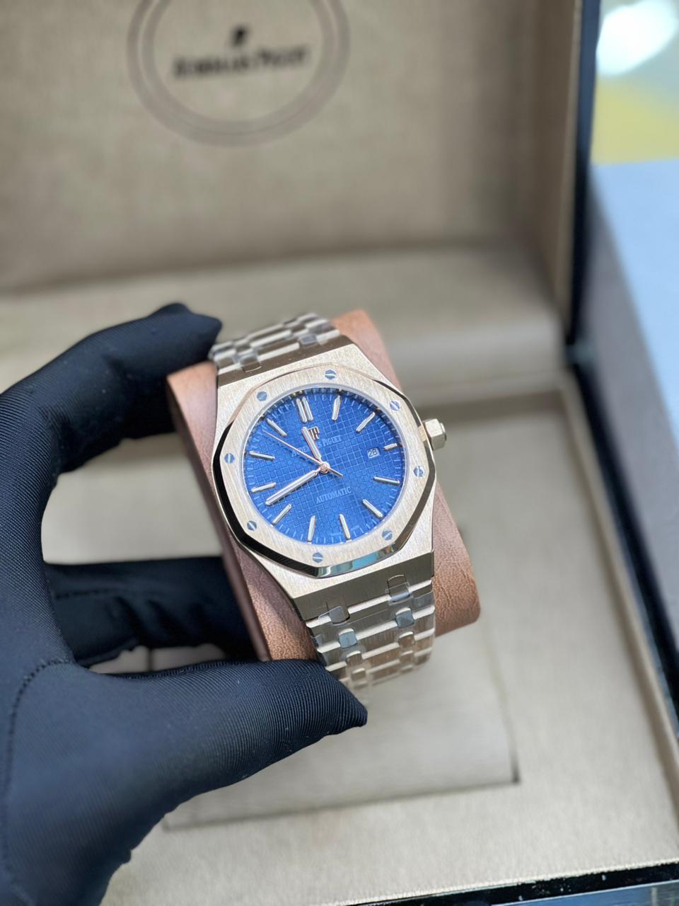 The Audemars Piguet Royal Oak Selfwinding 41 mm is a timeless icon of luxury sports watchmaking. Crafted from stainless steel, it showcases the legendary octagonal bezel with exposed screws and an integrated bracelet finished with alternating satin and polished surfaces. The vivid blue dial features the signature “Grande Tapisserie” pattern, applied luminous hour markers, and elegant hands, offering depth, texture, and excellent readability. Powered by a Swiss automatic movement with a date display at 3 o’clock, this Royal Oak combines technical excellence with unmistakable design.