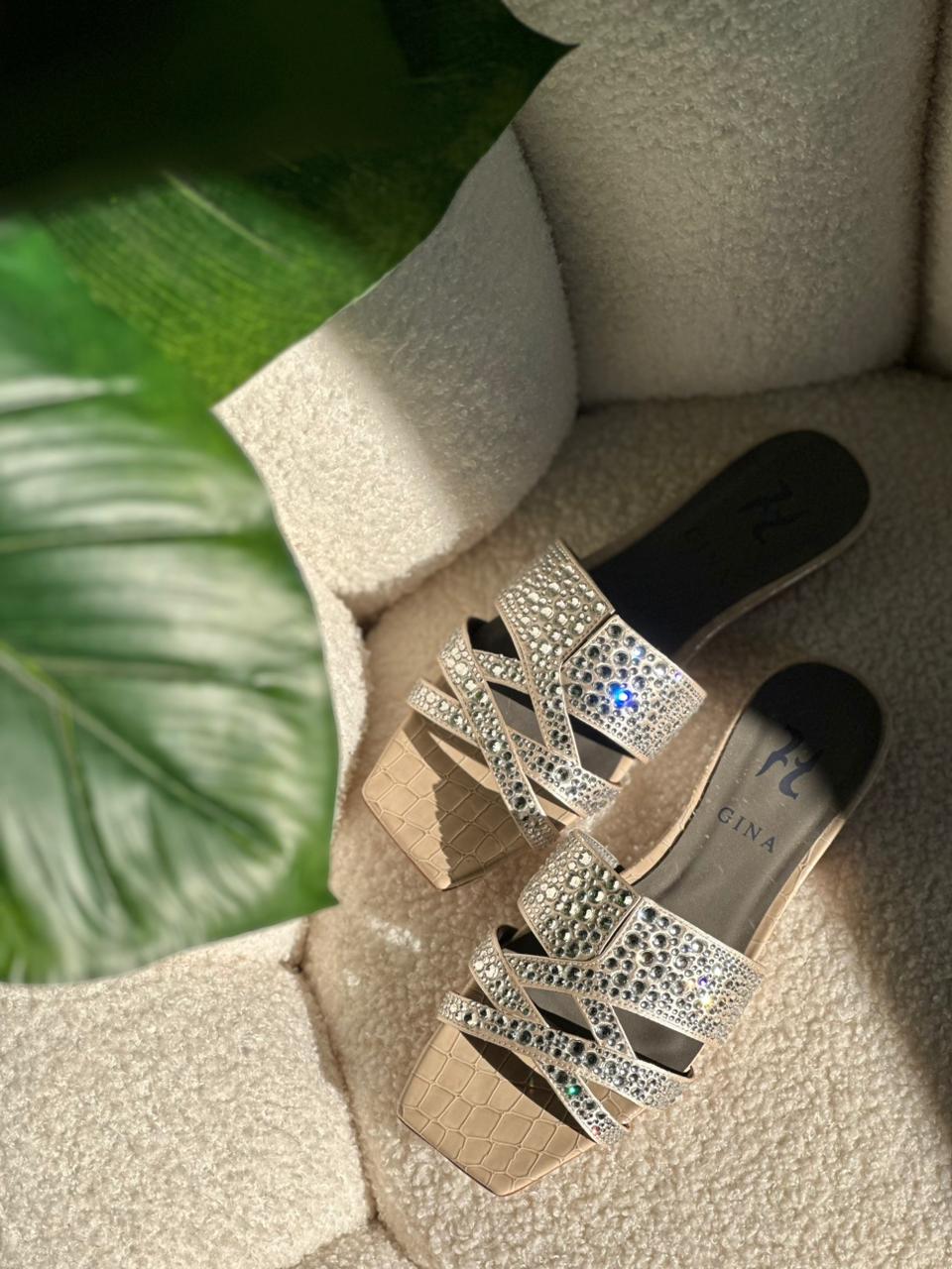 Elegant beige slide sandals featuring a crocodile-textured sole and multiple crisscross straps embellished with sparkling crystals. Designed by GINA, they offer a luxurious, eye-catching look perfect for dressy casual outfits and special occasions.