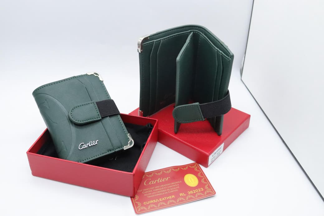 This refined Cartier compact wallet is crafted from smooth premium leather in a deep green tone, showcasing timeless elegance and luxury craftsmanship. Designed with a secure strap closure, it ensures your essentials stay safely organized. The interior features multiple card slots and compartments for cash, making it both practical and stylish. Finished with the iconic Cartier logo and presented in signature red packaging, it is ideal for daily use or gifting.