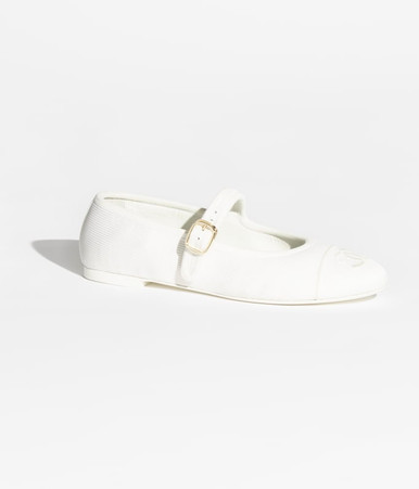 A pair of elegant white Chanel Mary Jane flats featuring a rounded toe, subtle CC embroidery, and double gold-tone buckle straps for a refined, classic look.