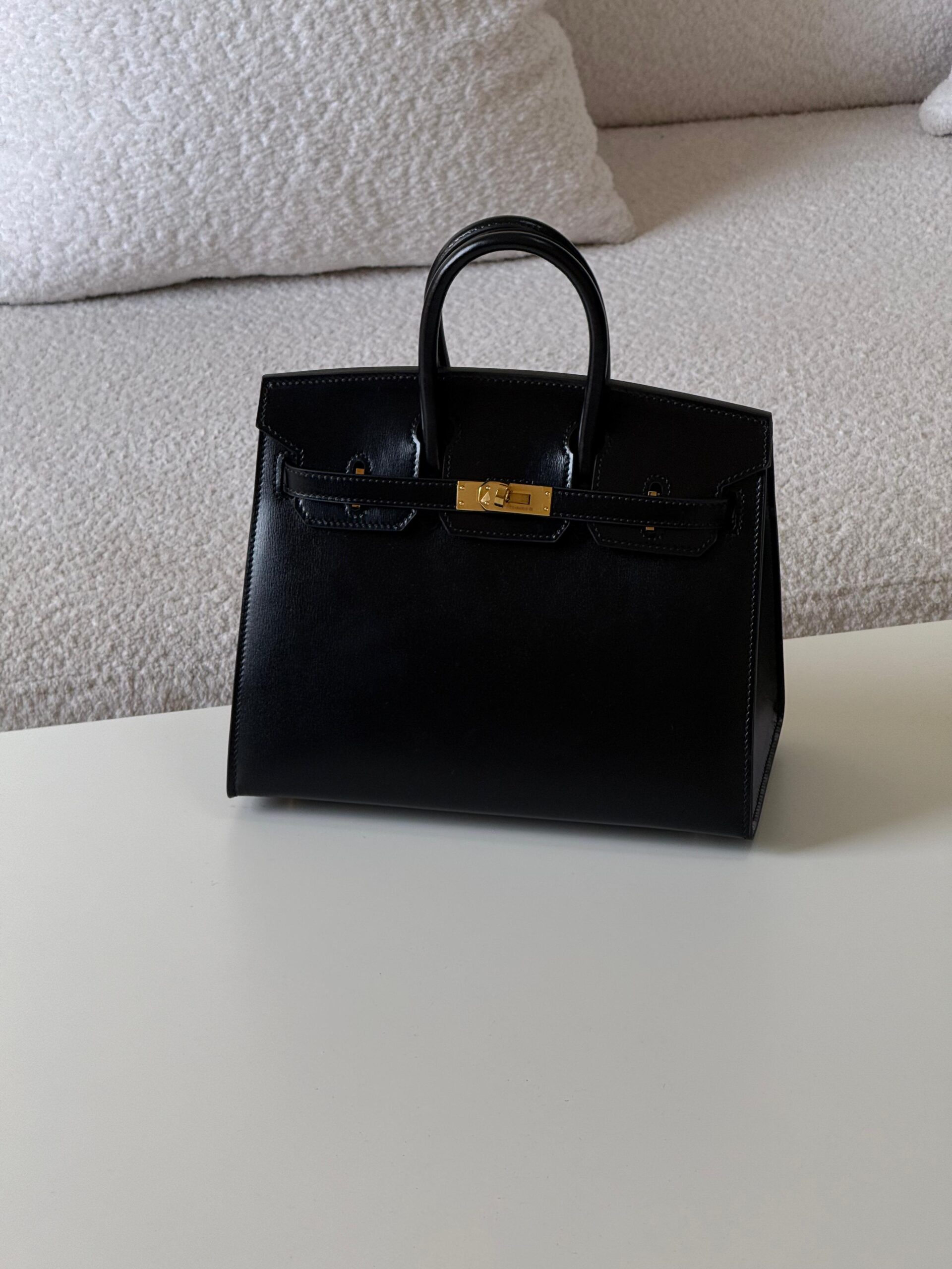 A refined top-handle handbag crafted from smooth black leather, featuring a structured silhouette and a polished gold-tone lock closure. Designed with clean lines and timeless elegance, this bag offers a sophisticated statement suitable for both professional and formal occasions.