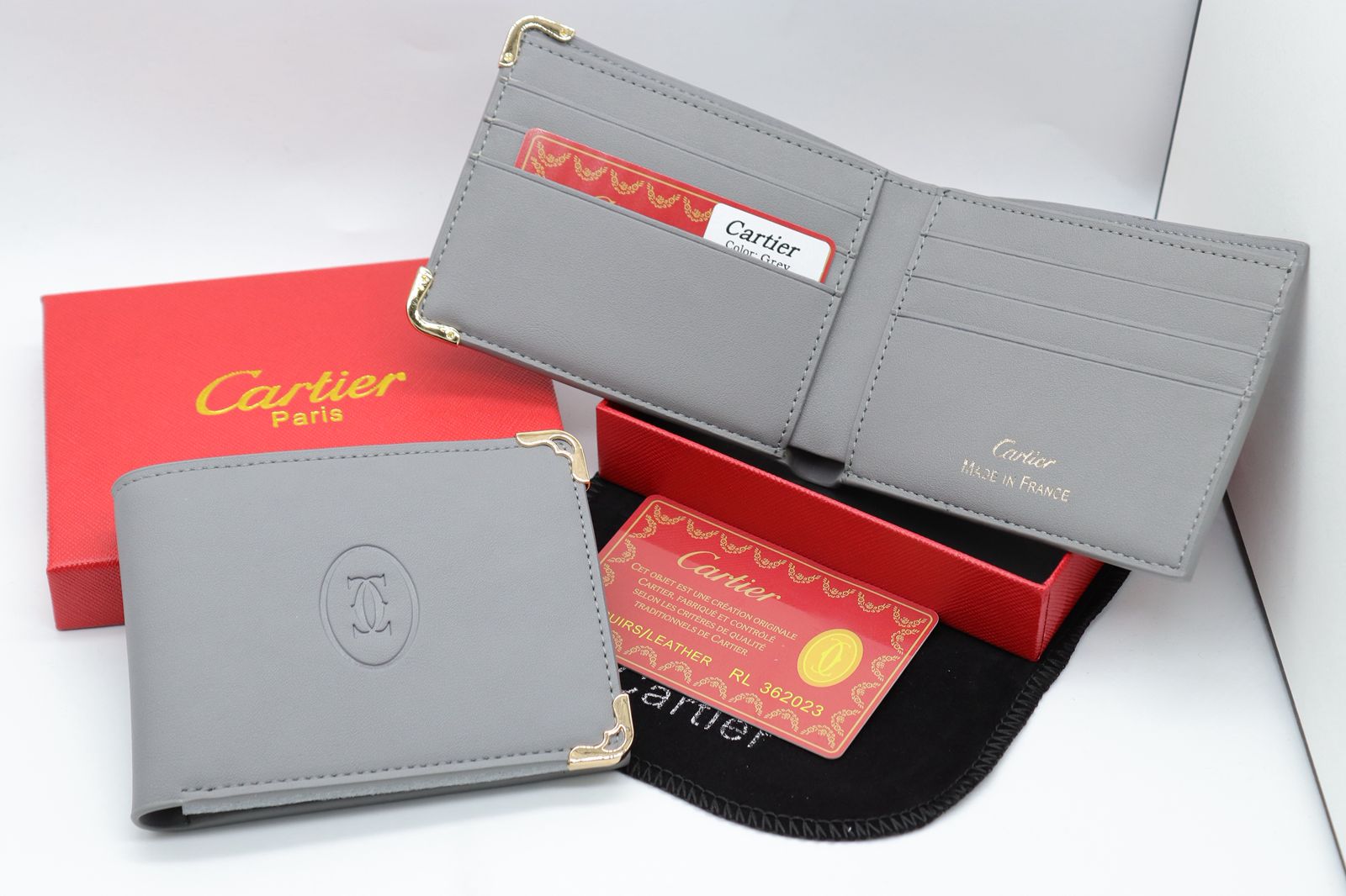 A sleek bifold wallet crafted in smooth grey leather with a refined, minimalist design. It features multiple card slots, a central cash compartment, and elegant gold-tone corner accents for added durability and style. The slim profile fits comfortably in pockets while offering organized storage for everyday essentials.