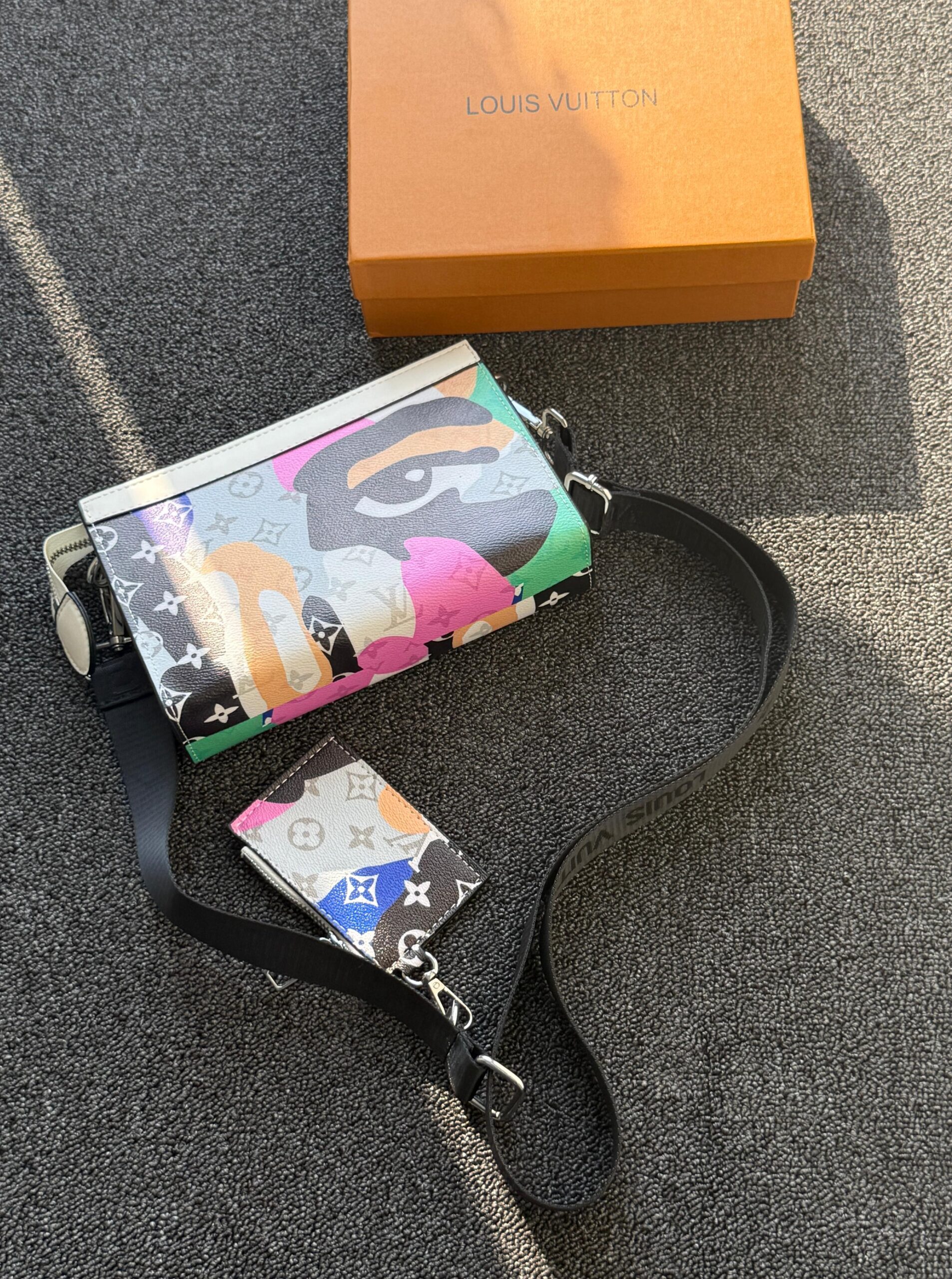 A vibrant Louis Vuitton crossbody bag featuring a multicolor abstract monogram design, paired with a matching card holder. The set includes a black adjustable strap and showcases bold, eye-catching artwork over the classic LV pattern, blending luxury with a modern artistic touch.