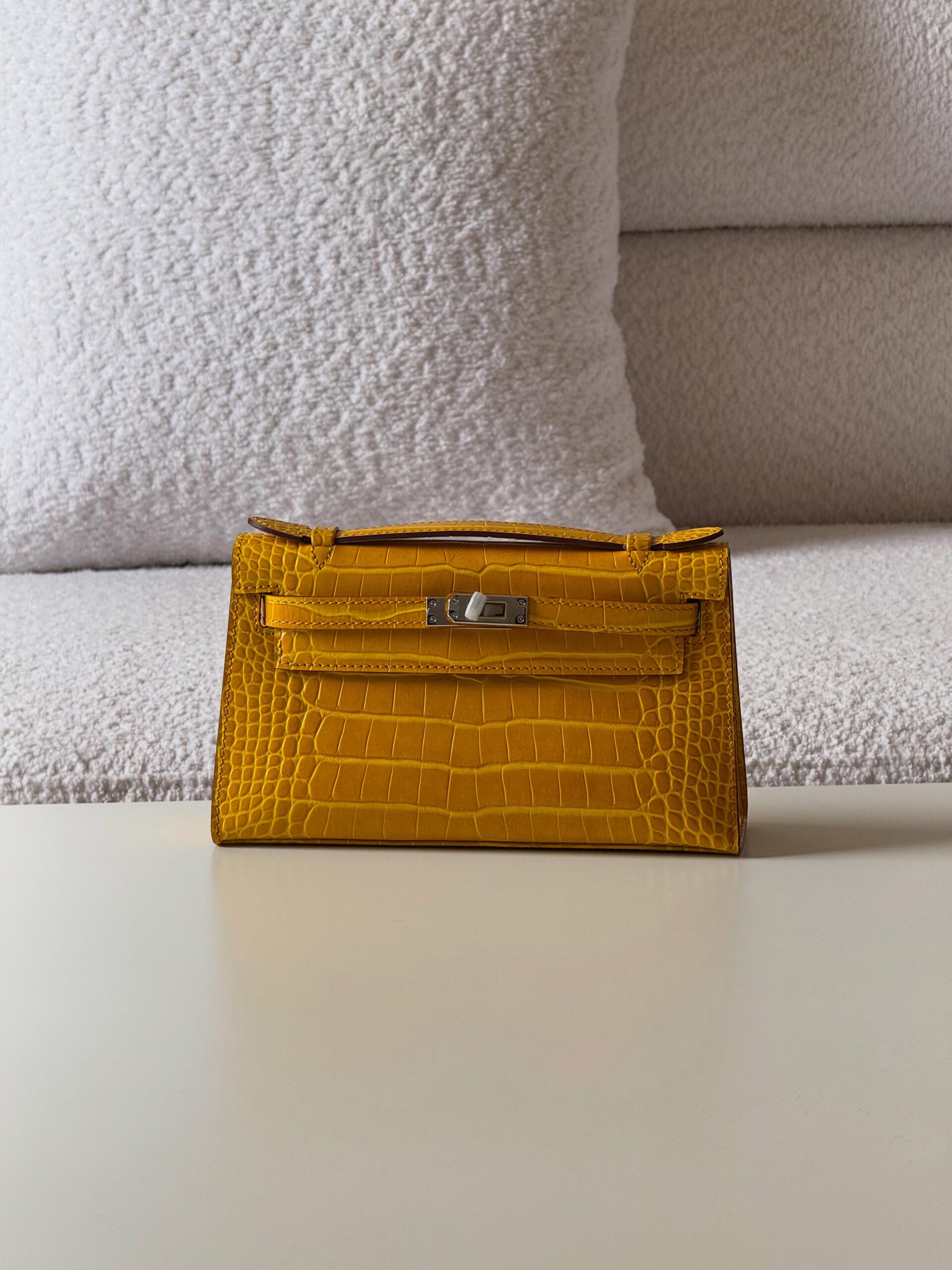 A vibrant mini top-handle clutch crafted from glossy croc-embossed leather in a rich mustard gold tone. Designed with a clean, structured silhouette and finished with a polished silver turn-lock closure, this statement piece adds warmth and sophistication to both daytime and evening ensembles.