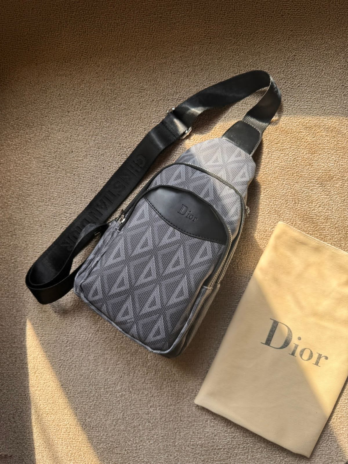 Grey Dior sling bag with a geometric pattern, black leather accents, and a Christian Dior logo strap, shown beside its dust bag.