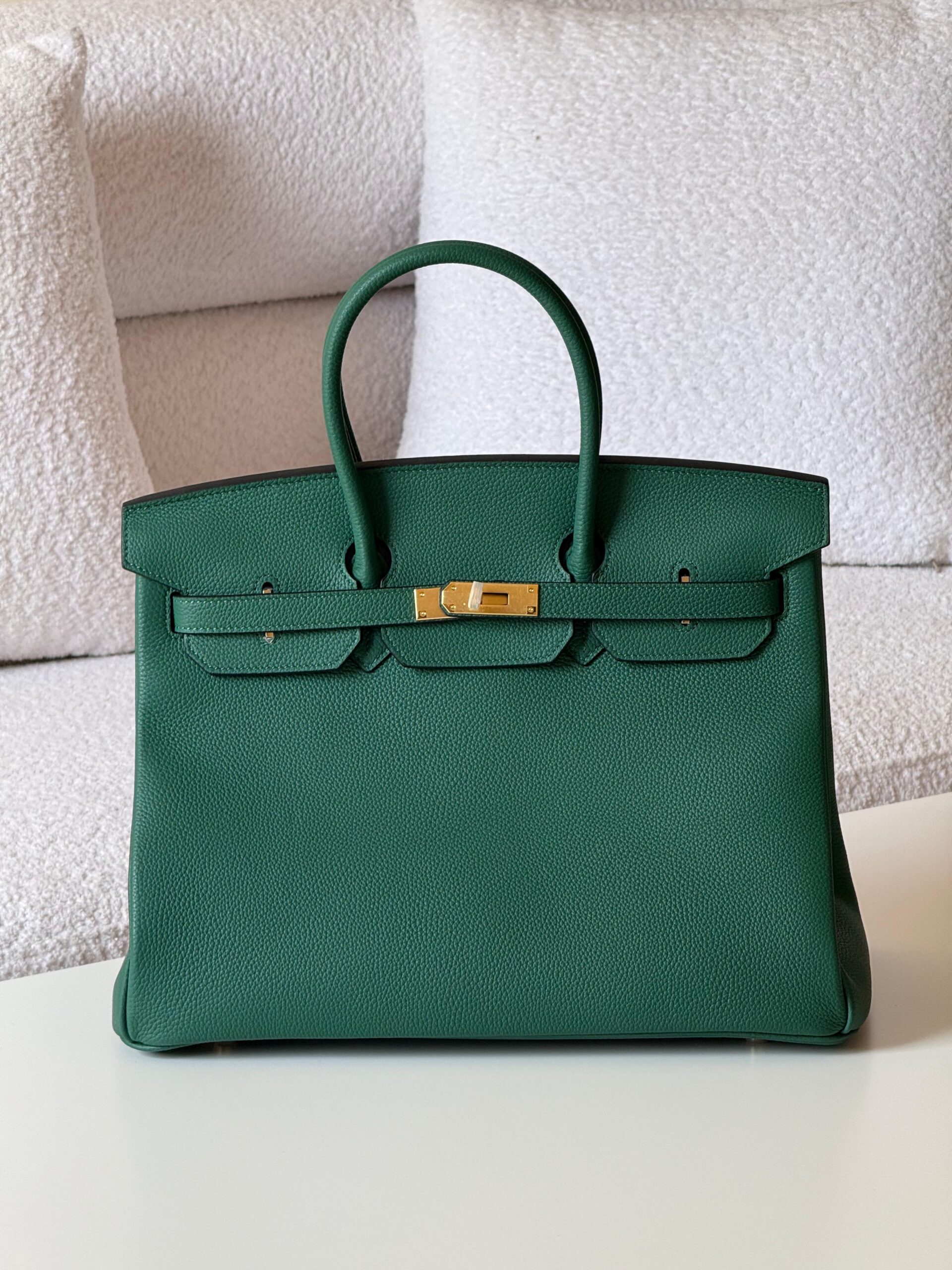 A striking top-handle handbag crafted from textured leather in a rich emerald green hue. Designed with a structured silhouette, double rolled handles, and a signature strap-and-turn-lock closure finished in gold-tone hardware, this bag delivers refined elegance with a bold, modern edge. Perfect for elevating both neutral and statement outfits.