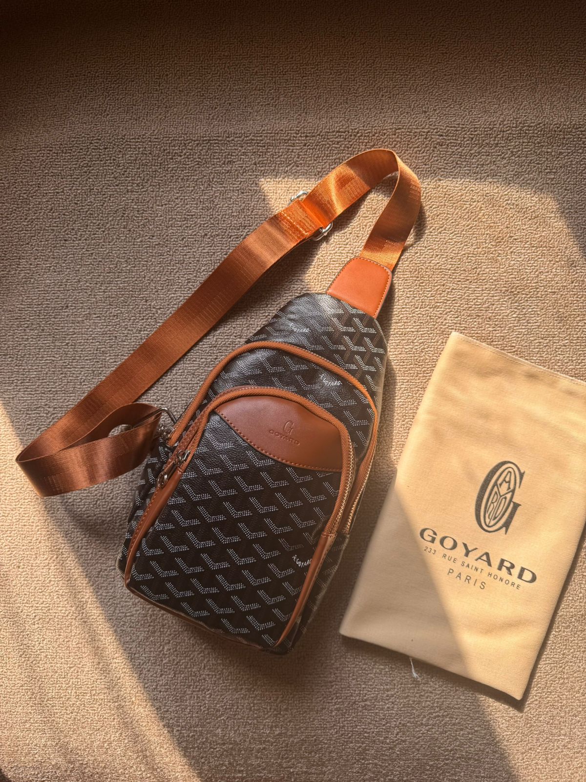 A compact Goyard crossbody sling bag featuring the signature Goyardine chevron pattern in black and grey, accented with tan leather trim. It has a front zip pocket, a main zip compartment, and an adjustable brown fabric shoulder strap. The bag is displayed next to a beige Goyard dust bag.