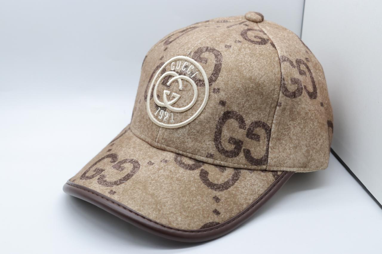 This Gucci baseball cap showcases the iconic GG monogram pattern in warm beige tones, reflecting the house’s timeless heritage. Crafted from a soft, suede-like fabric, it features a structured crown and a curved brim finished with smooth leather trim. The front is accented with an embroidered circular Gucci logo patch, adding a refined statement detail. Designed for both comfort and style, this cap effortlessly elevates casual and smart-casual looks.