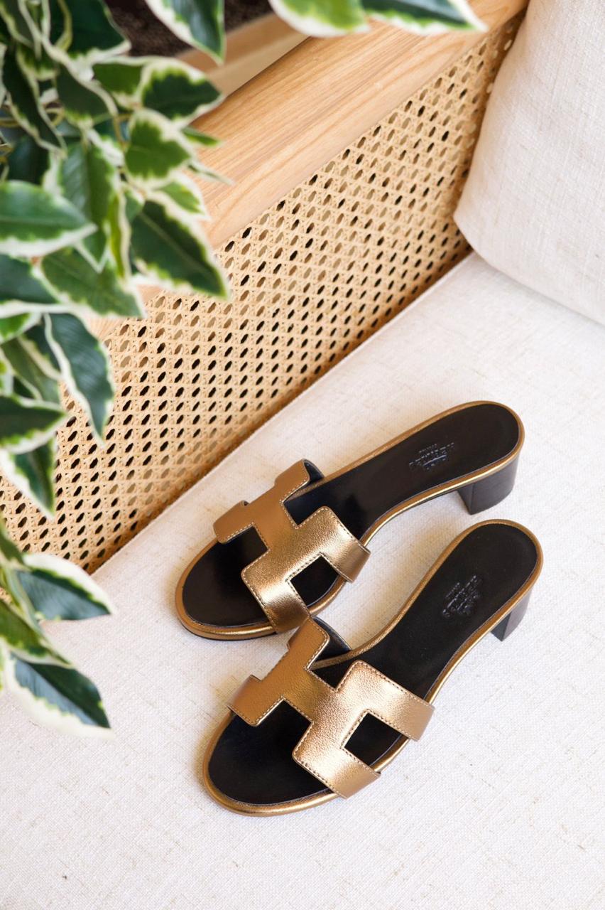 Hermès Oasis metallic leather heeled sandals with iconic H strap and a chic low block heel.