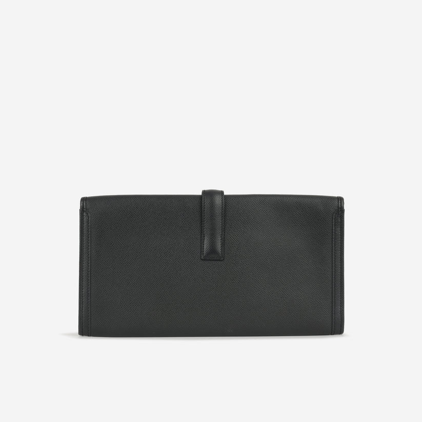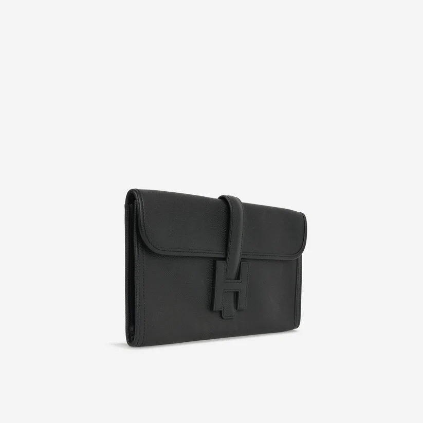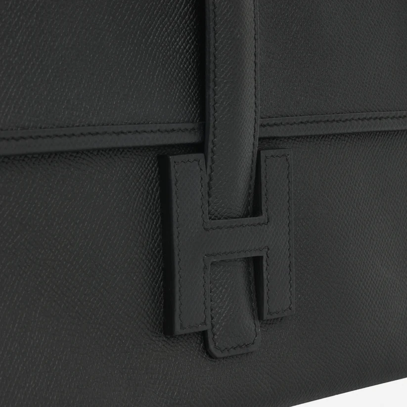 A refined and iconic Hermès Jige Clutch 29 crafted in black Epsom leather, featuring the signature “H” tab closure and a sleek envelope silhouette. Elegant, structured, and timeless, it’s a versatile accessory perfect for formal occasions or sophisticated everyday styling.
