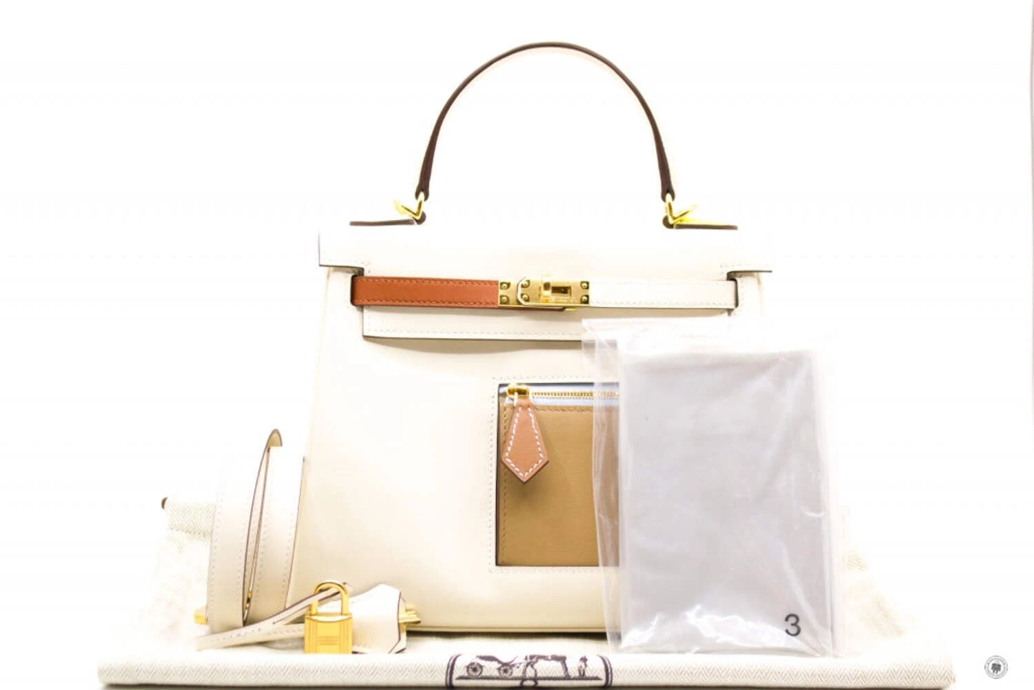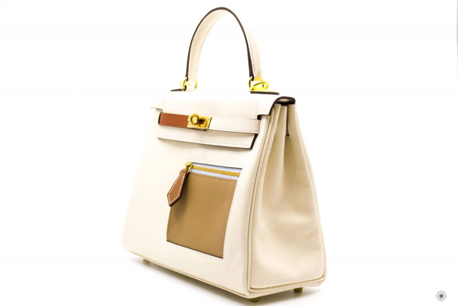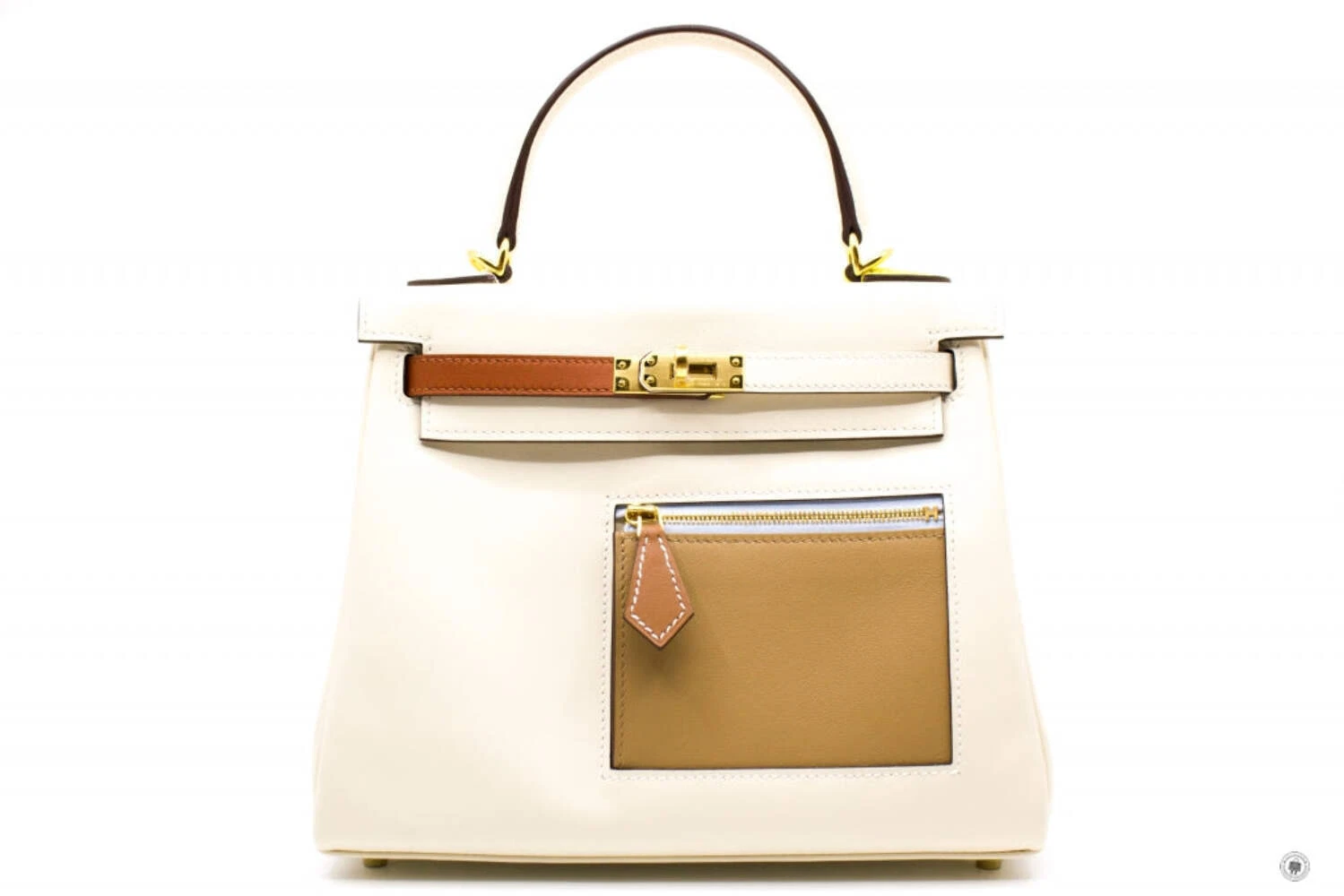 The Hermès Kelly Colormatic handbag in white and tan is a refined expression of timeless luxury with a modern twist. Crafted from premium leather, it showcases the iconic Kelly silhouette with a structured top handle, detachable shoulder strap, and signature turn-lock closure in gold-tone hardware. The contrasting tan front zip pocket and strap detail add visual depth and functionality, making this elegant piece suitable for both daytime sophistication and elevated evening wear.