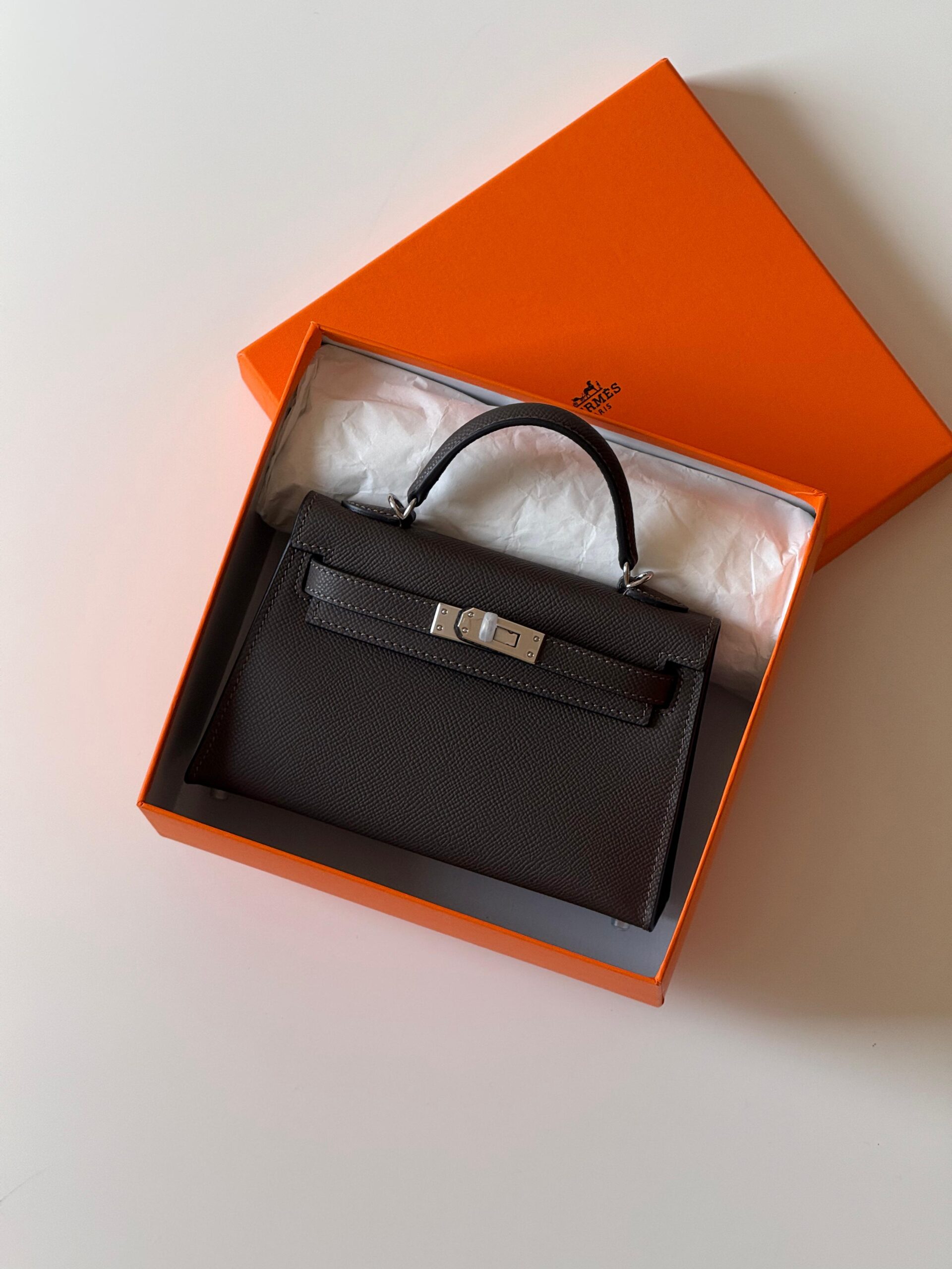 The Hermès Kelly Mini II is an iconic silhouette rendered in structured Epsom calfskin, celebrated for its refined grain and excellent shape retention. This elegant miniature features the signature Kelly turn-lock closure, a single top handle, and sleek palladium-plated hardware. Finished in Etain—a versatile deep grey—the bag offers timeless sophistication and effortless versatility, making it a coveted piece for both day and evening wear.