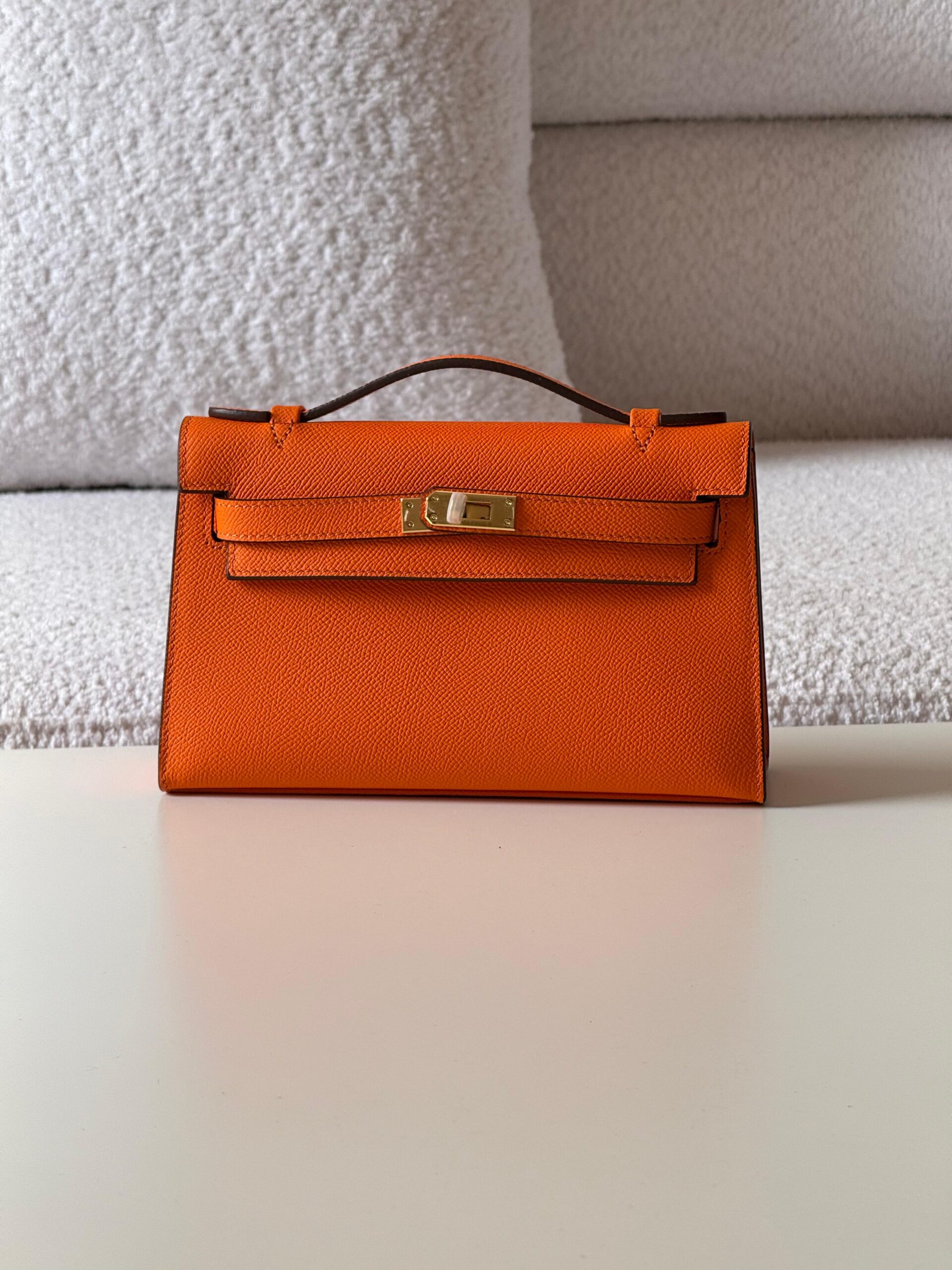 The Hermès Kelly Pochette in vibrant orange is a bold yet timeless statement piece. Crafted from finely grained leather, this elegant clutch showcases the iconic Kelly design with a structured silhouette, slim top handle, and signature turn-lock closure in polished hardware. The striking color adds a touch of sophistication and energy, making it ideal for both evening occasions and elevated daytime styling.