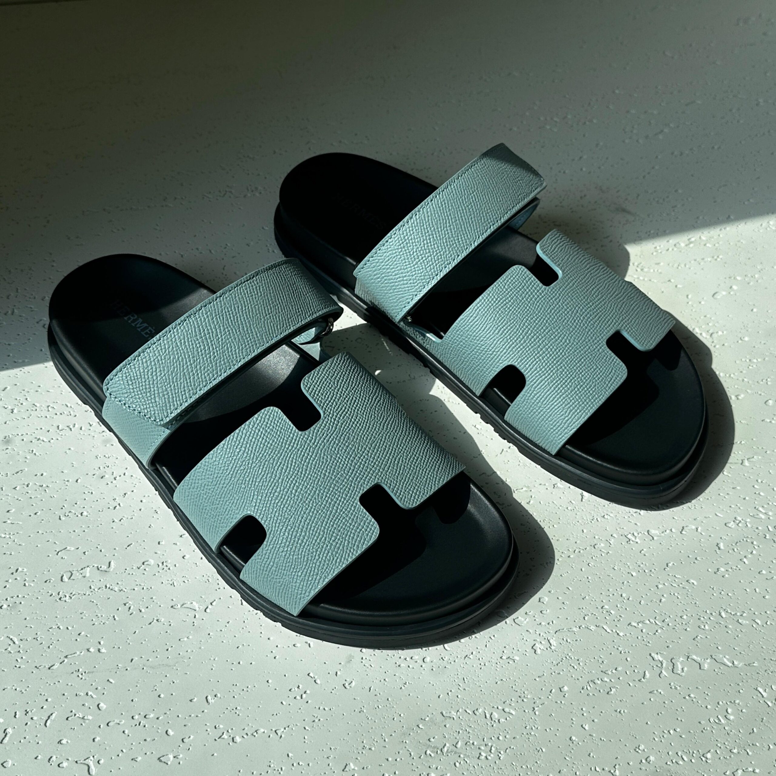These Hermes slide sandals feature textured light blue leather straps with the iconic “H” cut-out design. Combining elegant craftsmanship with casual comfort, they are perfect for a stylish and relaxed look.