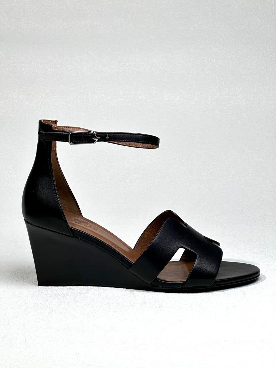 The Hermès Oasis wedge sandals reinterpret the House’s iconic design with elegant height and everyday comfort. Crafted from smooth black leather, the sandal features the signature cut-out “H” vamp, an adjustable ankle strap with buckle fastening, and a streamlined wedge heel for stable support. Finished with a leather-lined insole, this timeless style transitions effortlessly from daytime sophistication to evening refinement.