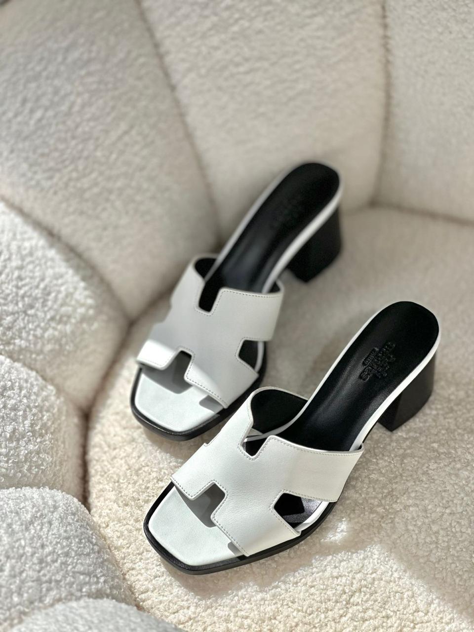 A modern interpretation of the iconic Oran sandal, this Hermès design is crafted from smooth white leather with the house’s signature H-cut strap. The sandal is set on a sleek black mid-height block heel, creating a striking contrast while ensuring comfort and stability. The open-toe, slip-on silhouette makes it an elegant yet effortless choice, perfect for both refined daytime looks and polished evening wear.