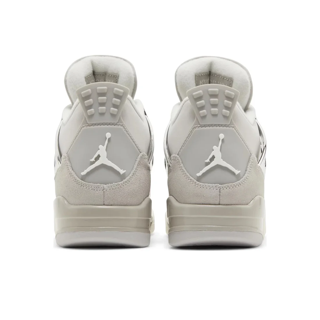 The Women’s Air Jordan 4 Retro Frozen Moments (AQ9129-001) has a pale grey suede and matching overlay in glossy leather. Breathable netting is used on the throat and quarter panel, while the shoe’s molded eyelets and support wings are in a metallic silver finish. Jumpman branding