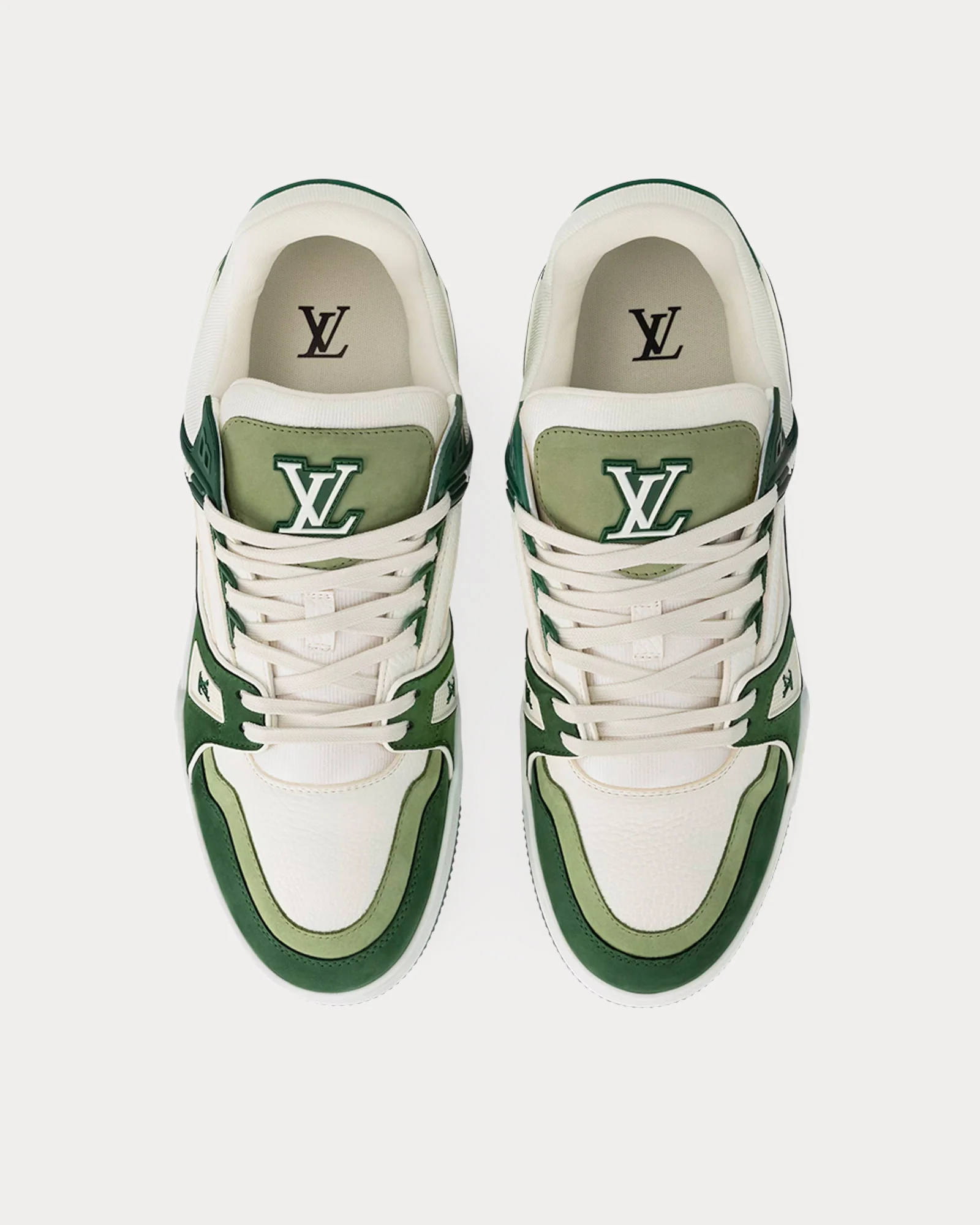 The men’s Louis Vuitton LV Trainers low top sneakers in khaki green are designed by Virgil Abloh and feature nubuck calf leather and grained calf leather uppers, 7 hours of stitching for 1 pair, rubber outsole, LV Initials on the tongue and side, Louis Vuitton signature on the side, and Monogram Flowers on the outsole. Made in Italy.