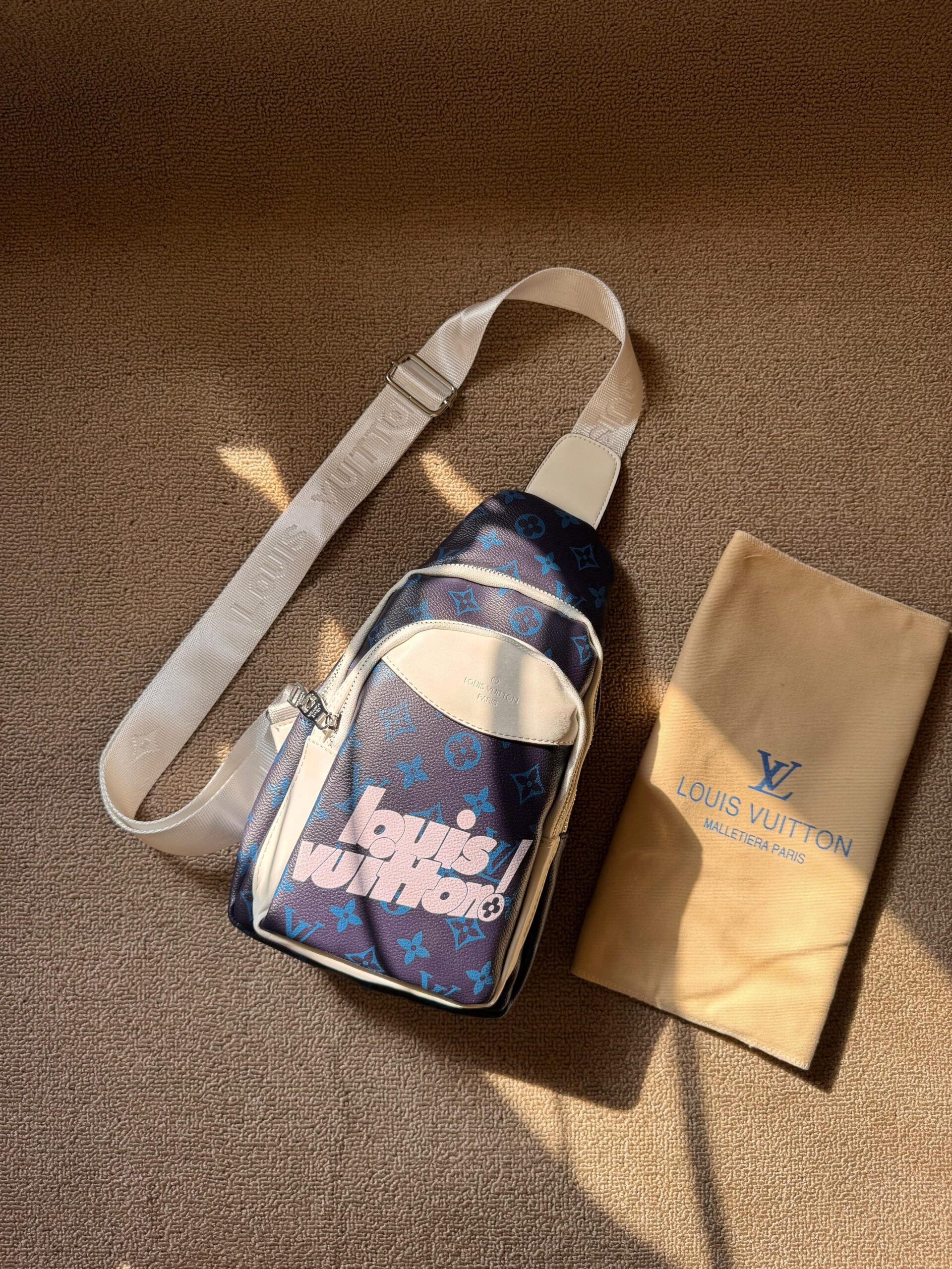 A bold Louis Vuitton sling bag featuring a blue monogram graffiti-style print on a dark base, accented with cream leather panels and detailing. It includes a front zip pocket, the modern “Louis Vuitton” graffiti text, and a wide cream adjustable shoulder strap. Comes with a matching Louis Vuitton dust bag.